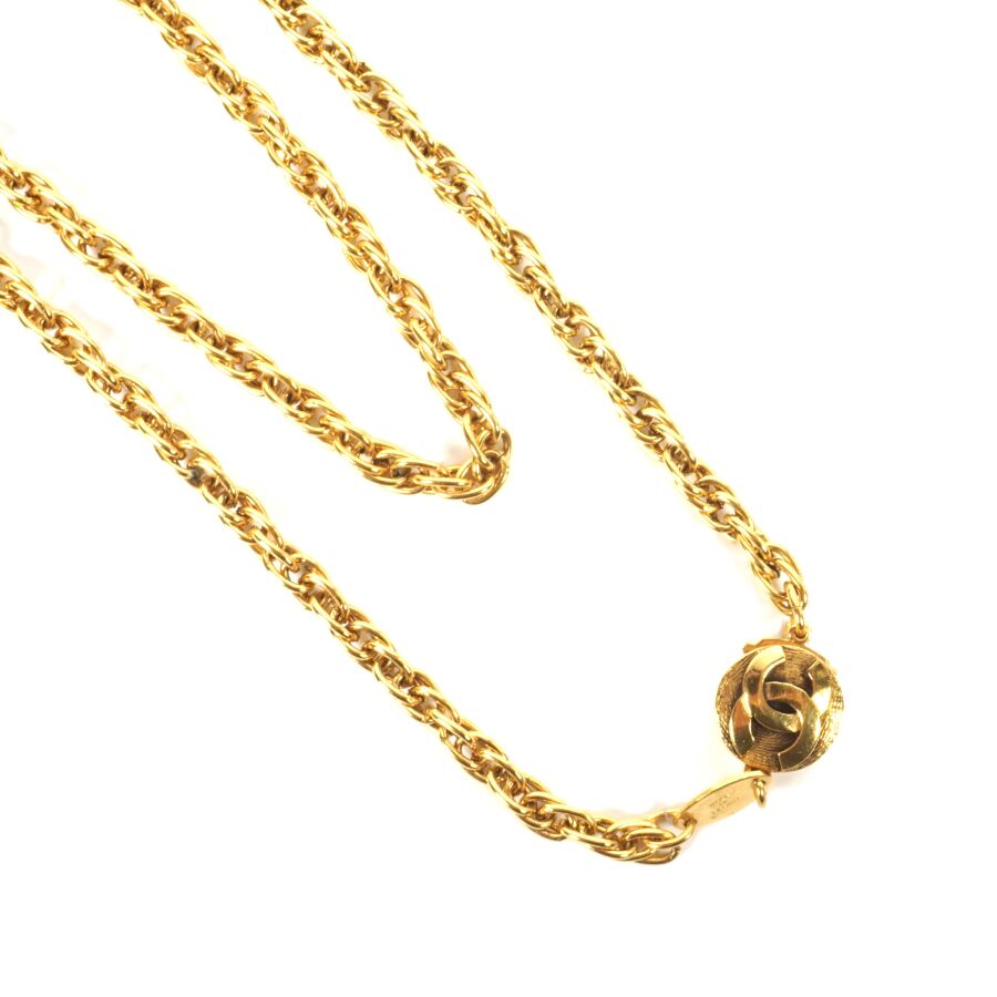 CHANEL : Sautoir en métal doré, chaîne à double anneaux, fermoir à cliquet circulaire logoté du double C, signé sur une plaque et daté 1982, L. 86.5 cm.