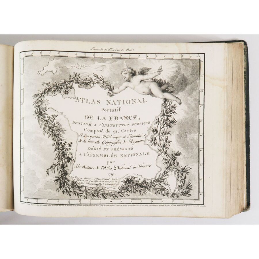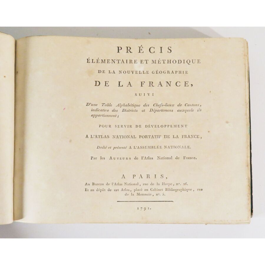 CHANLAIRE (P. G.) & DUMEZ. Précis élémentaire et méthodique de la nouvelle géographie de la France, suivi d'une table alphabétique des chefs-lieux de cantons, indicative des districts et départemens auxquels ils appartiennent ; pour servir de développement à l'atlas national portatif de la France. - Atlas national portatif de la France, destiné à l'instruction publique. Paris, au bureau de l'atlas national, 1791. In-4 oblong, demi-maroquin vert, dos lisse orné (reliure de l'époque).