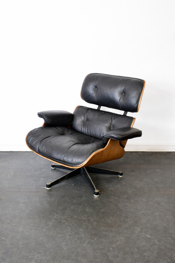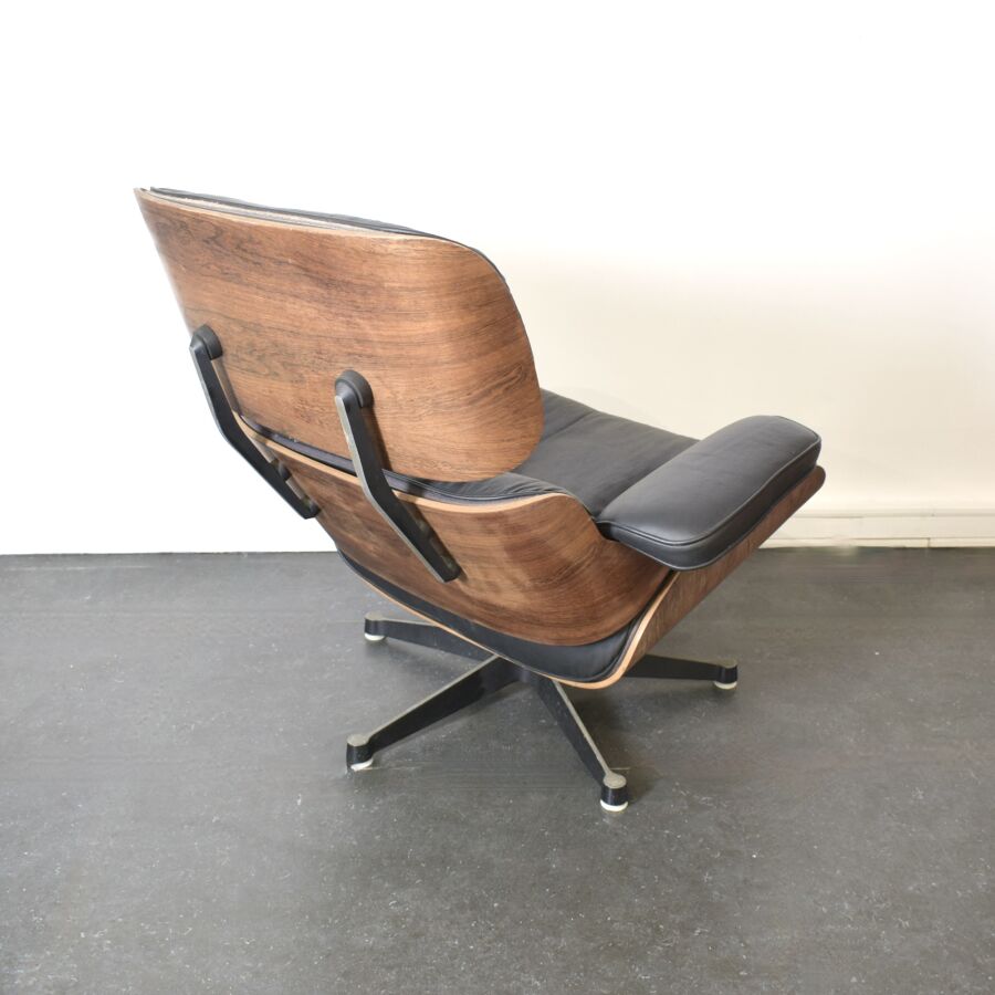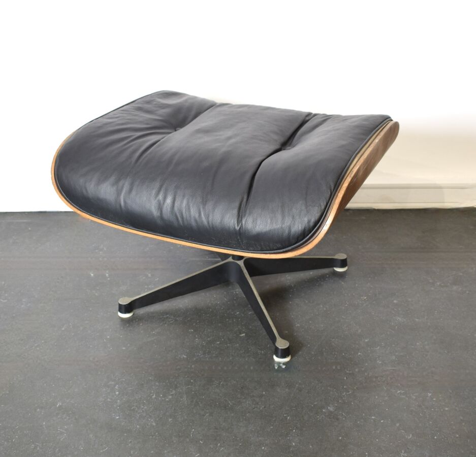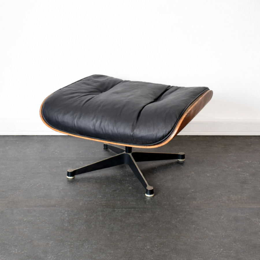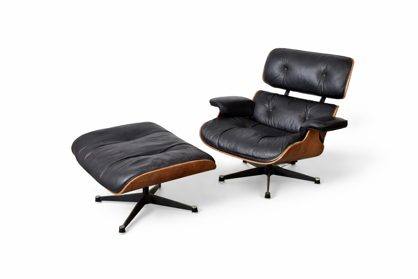 Charles (1907-1978) et Ray (1912-1988) EAMES : Fauteuil modèle "Lounge Chair" et son ottoman, coque en bois thermoformée en bois lamellé collé et plaqué, piètement en aluminium, garniture en cuir noir, étiquette "Mobilier International 162, Bd Voltaire Paris, 805 72 67", Dim. Fauteuil : H. 82 x 86 x 85 cm ; Dim. Ottoman : 44 x 66 x 54 cm. (restaurations, rayures et légers manques sur la coque, griffures et frottements)