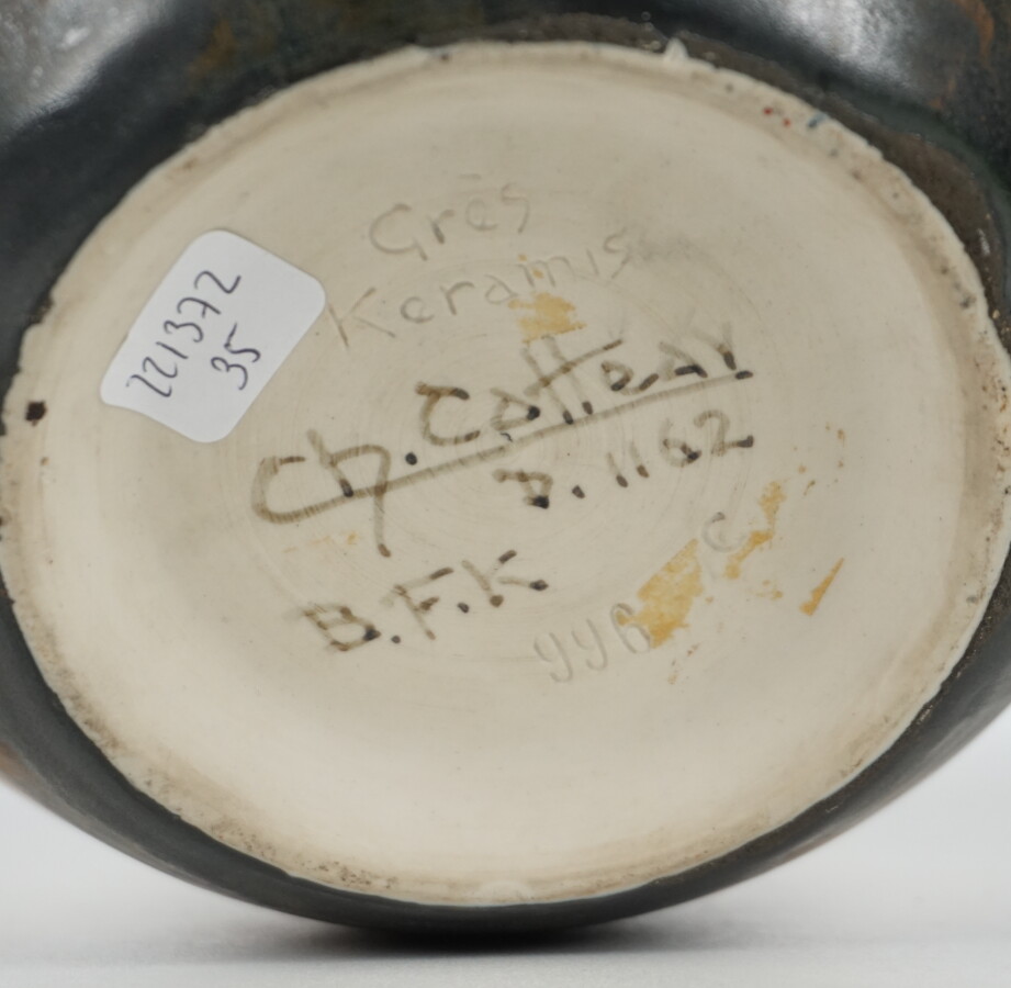 Charles CATTEAU (1880-1966) pour KERAMIS : Vase de forme ovoïde en grès émaillé à décor brun et ocre sur fond beige, signé dessous, numéroté 1162 et B.F.K, H. 23.5 cm (légères rayures à l'émail).