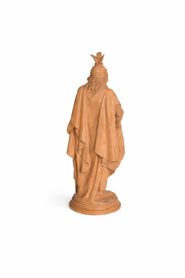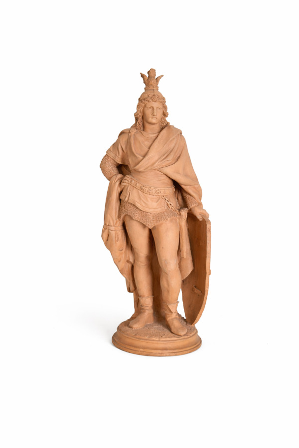 Charles Emile JONCHERY (1873-1937), "Chevalier médiéval au bouclier orné d'un dragon", statuette terre cuite, signée sur la base, H. 45 cm. (manques)
