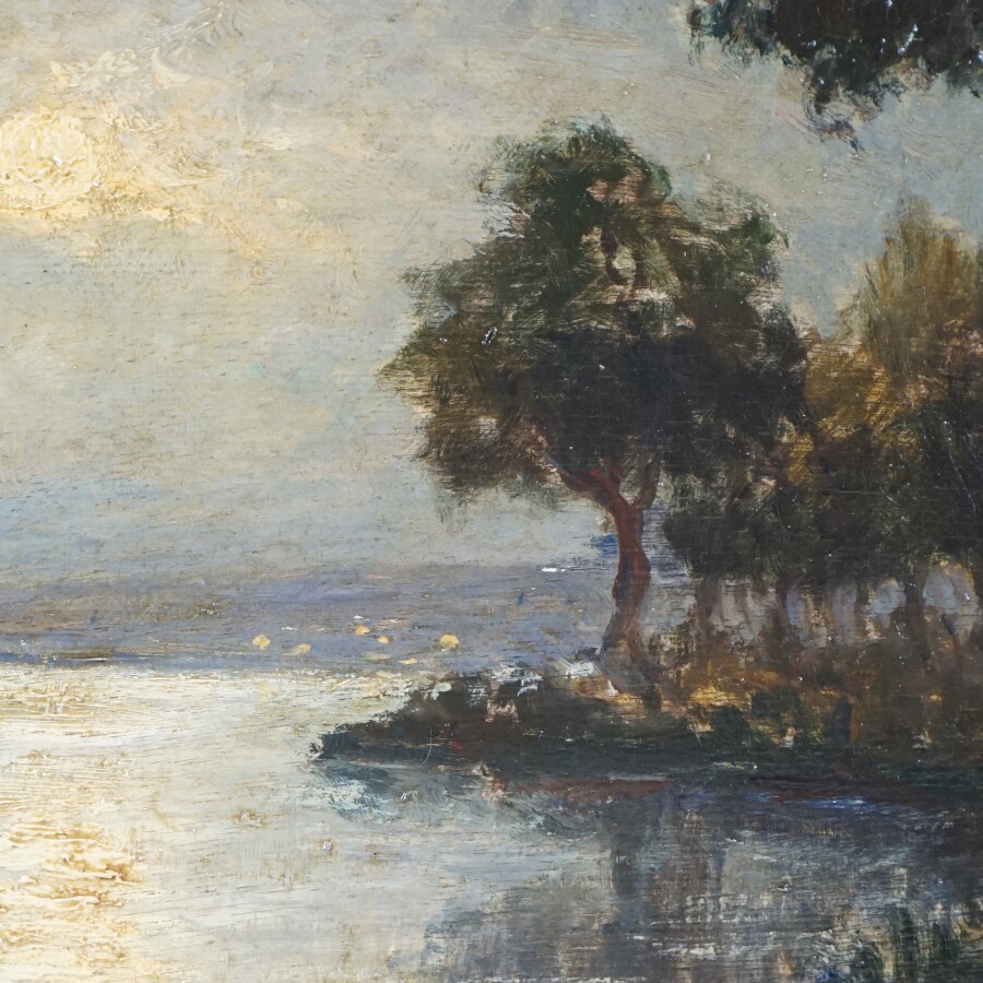 Charles HENRY (XIX-XX), "Paysage en bord de lac", huile sur toile signée en bas à gauche, 22 x 26.5 cm.