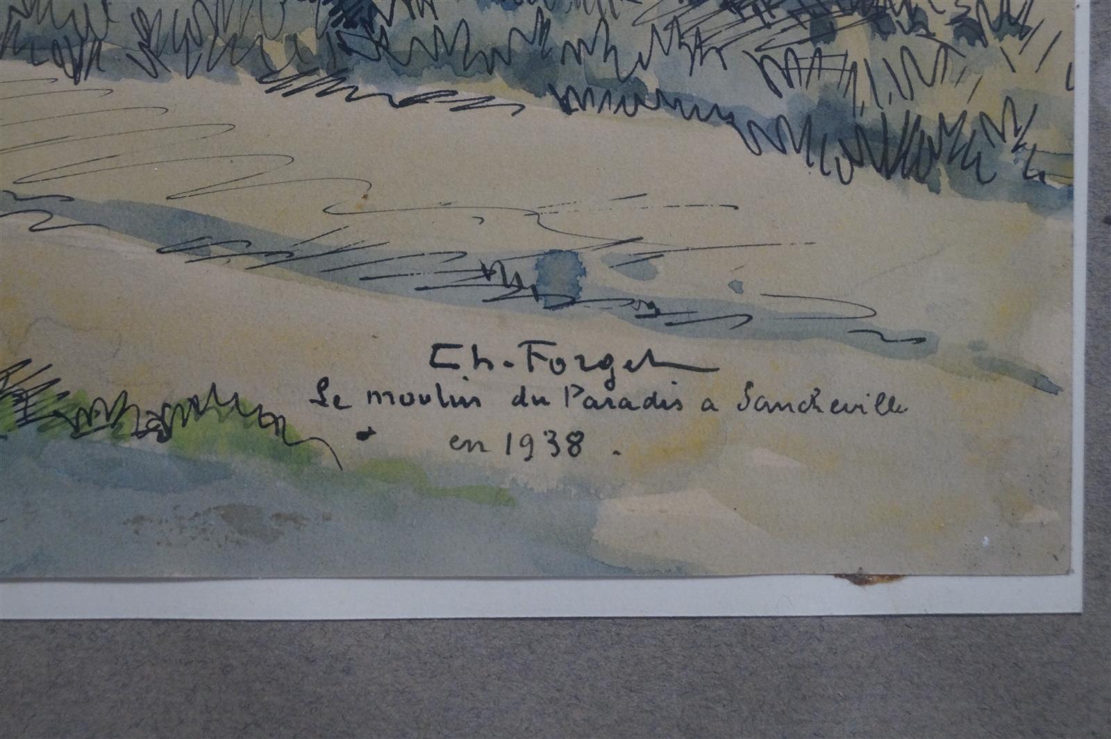 Charles Jean FORGET (1886-1960), "Le Moulin du paradis à Sandeville", 1938, encre et aquarelle sur papier signée, titrée et datée en bas à droite, 27 x 37 cm.