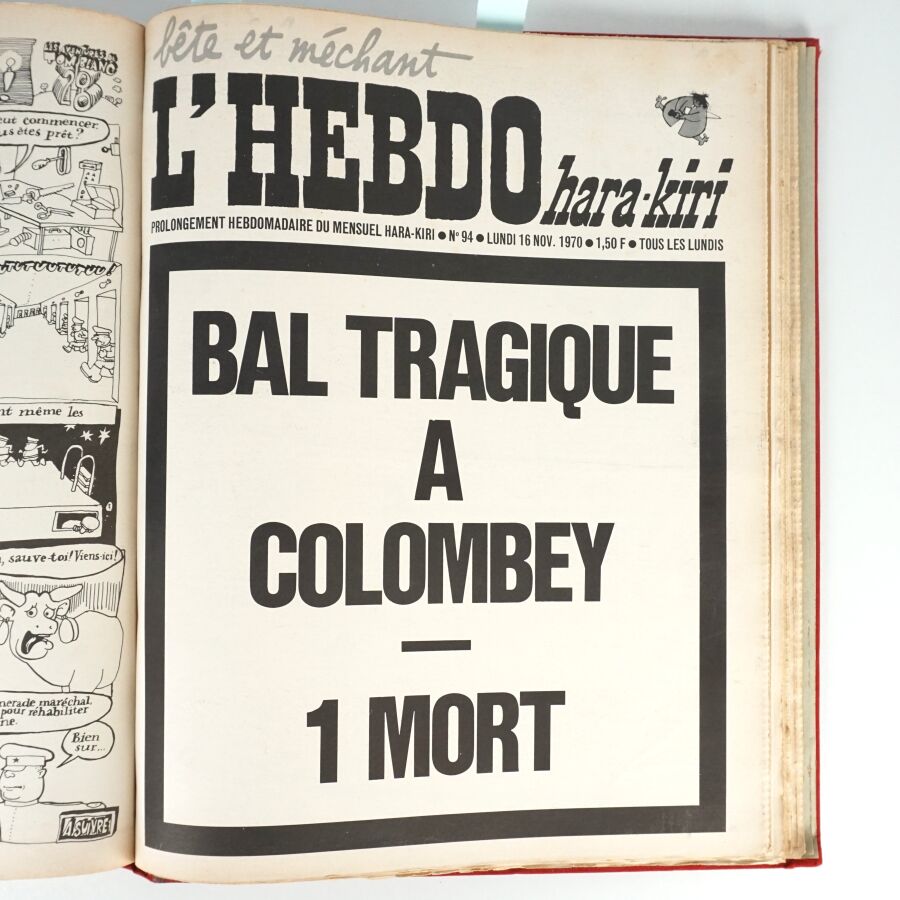 Année 1970 : L'Hebdo Hara-Kiri du n°49 (5/1/70) au n°94 (16/11/70 ""Bal tragique à Colombey…"") puis Charlie Hebdo n°1 (23/11/70) au n°6 (28/12/70).