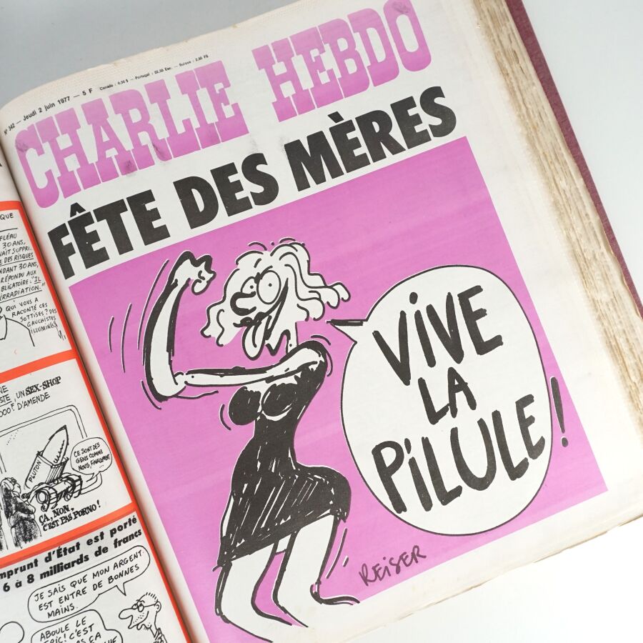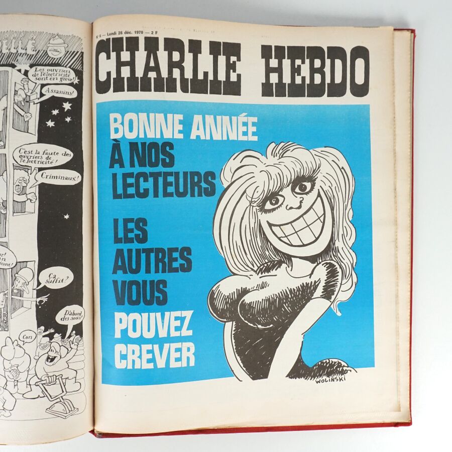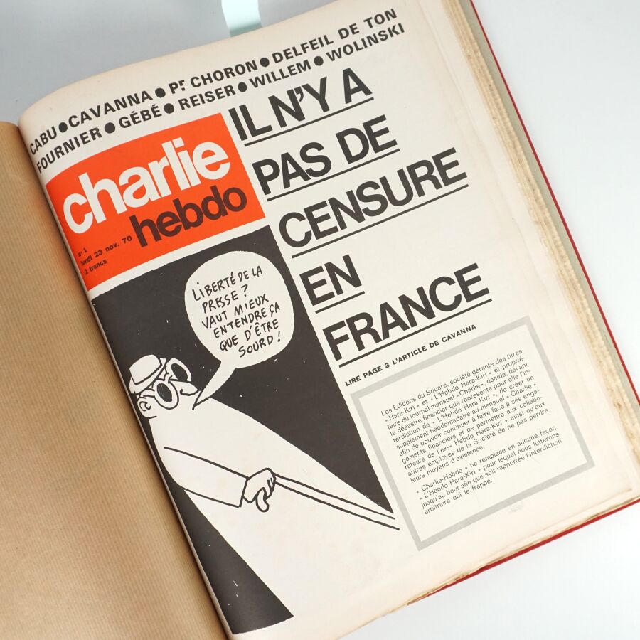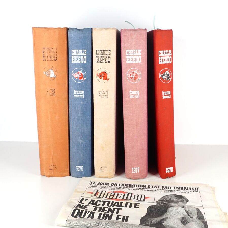 CHARLIE HEBDO. Ensemble de 5 grands albums in-folio renfermant les numéros de Charlie Hebdo - L'Hebdo Hara Kiri. 5 volumes in-folio cartonnage toile de couleurs de l'éditeur (qqs petites usures).