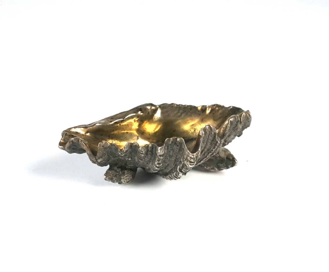 Charmant saleron "Bénitier" en argent, poinçon anglais "lion passant", intérieur vermeillé, reposant sur 2 petits coquillages, L. 8.5 cm. Poids brut : 175.3 g environ.