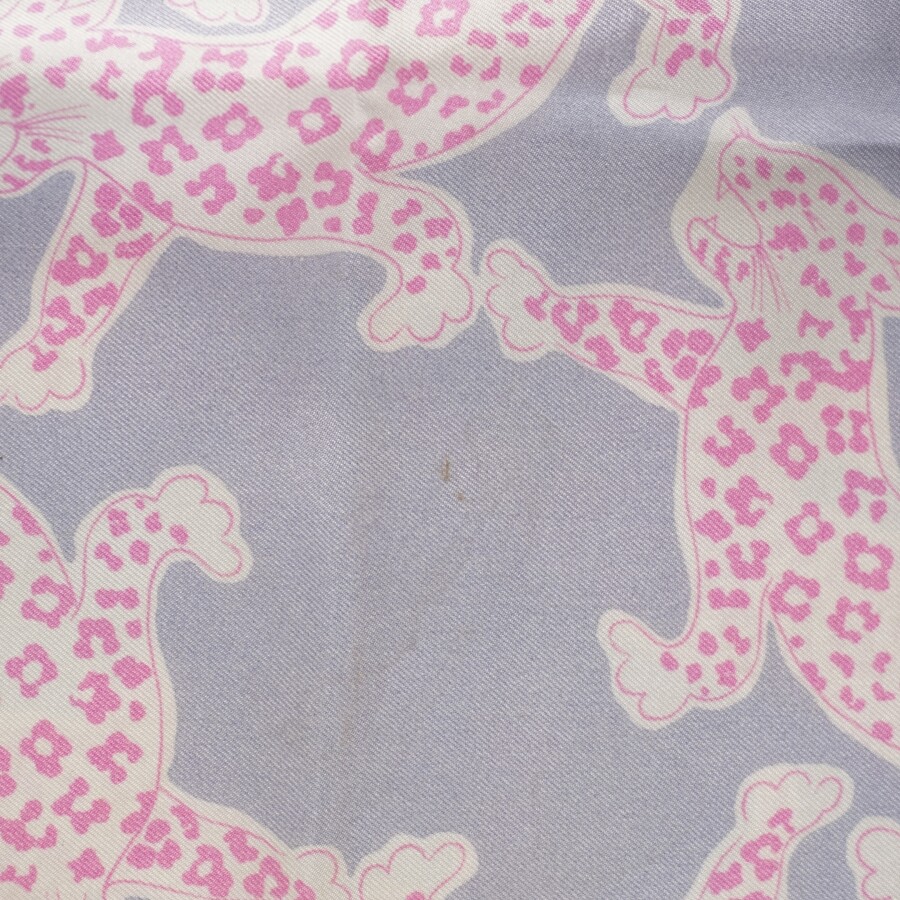CHARVET : Carré de soie imprimé à décor de léopards roses, fond lilas, marge écrue, 87 x 87 cm (taché).