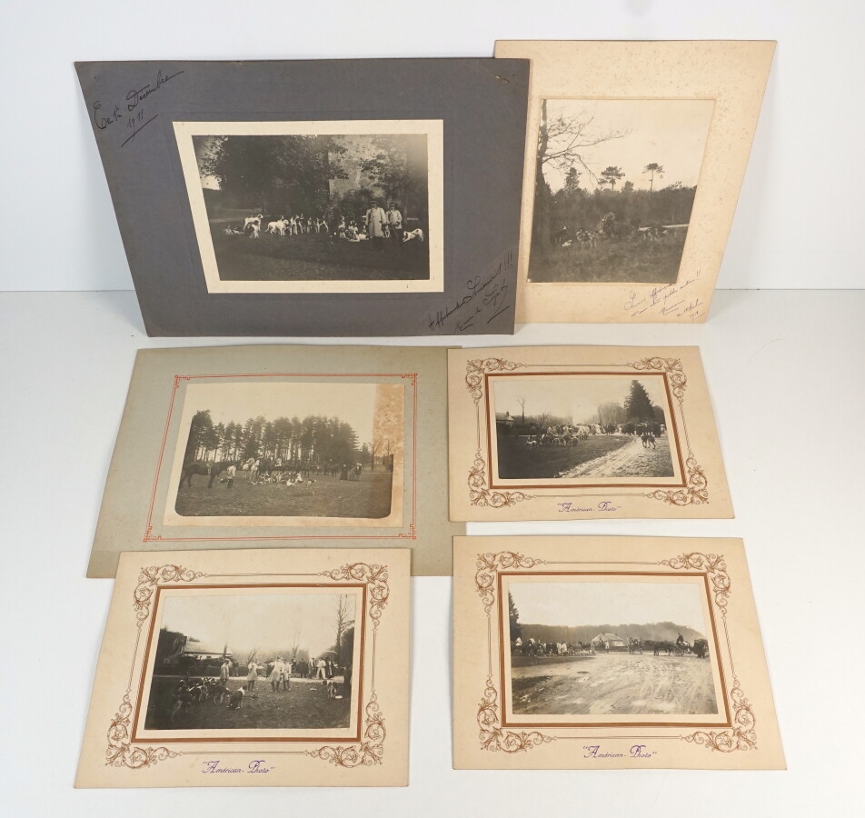 [CHASSE - PHOTOGRAPHIE] - Ensemble de 6 photographies montées sur papier fort représentant des scènes de chasse à courre vers 1910-1920 - 3 d'entre-elles portent le cachet " American-Photo " à Montreuil, 1 autre avec légendée manuscrite au dos : " février 1911 à Buchignon " - Bon état général.
