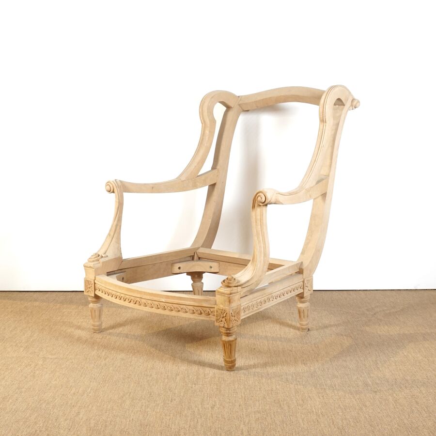 Châssis de fauteuil à haut dossier et oreilles de style Louis XVI, bois sculpté et mouluré, 20ème siècle, H. 92 cm.