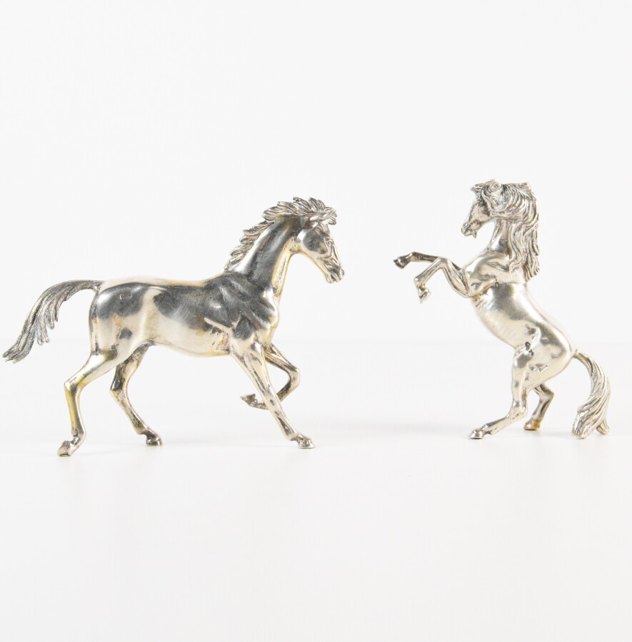 "Cheval cabré" & Cheval au galop", deux sujets de vitrine en métal argenté, H. 8.5 cm, L. 12 cm.