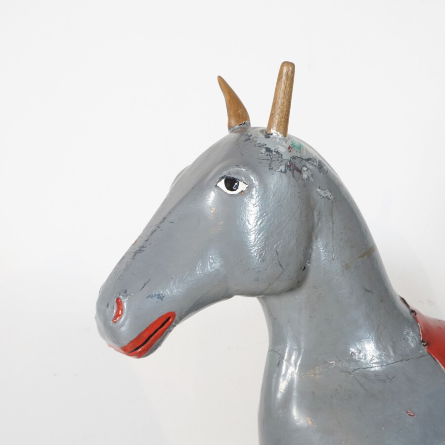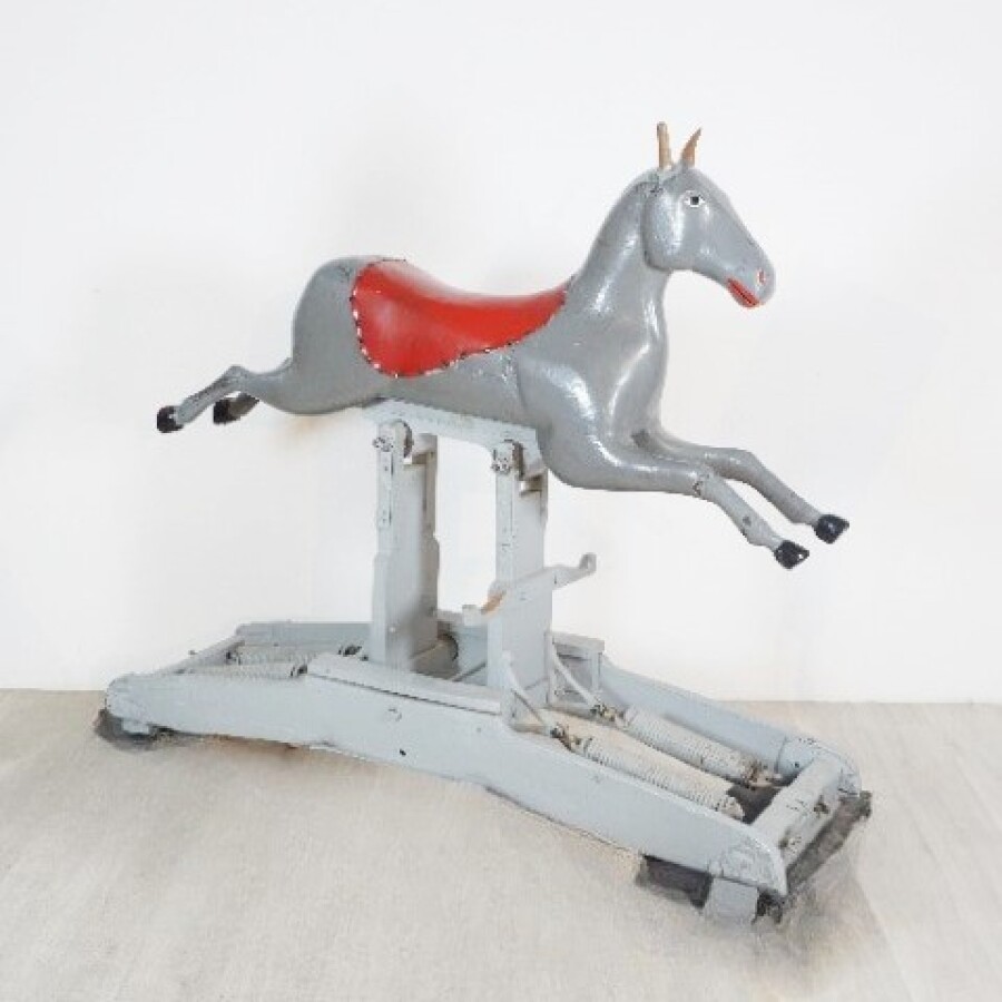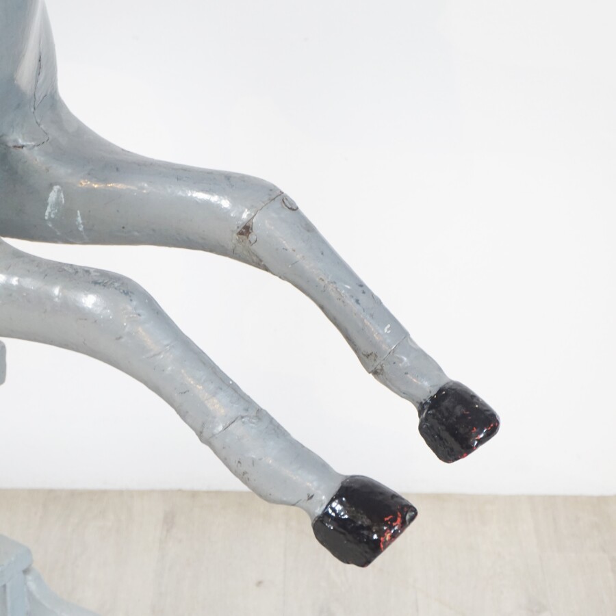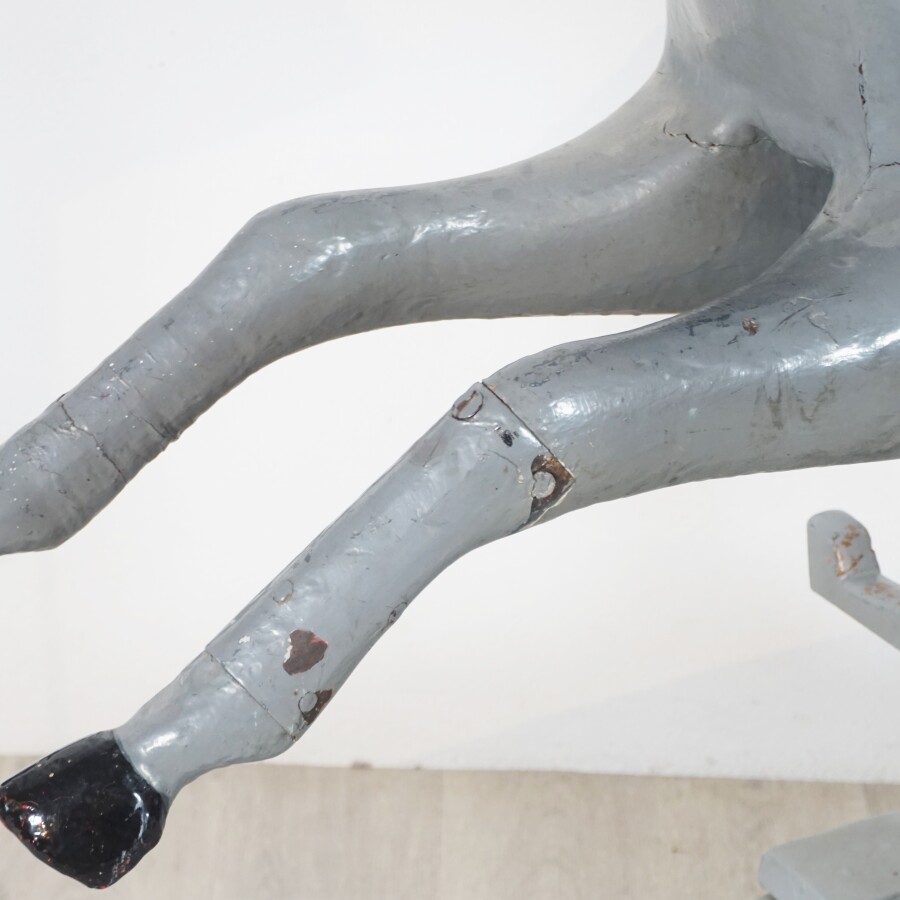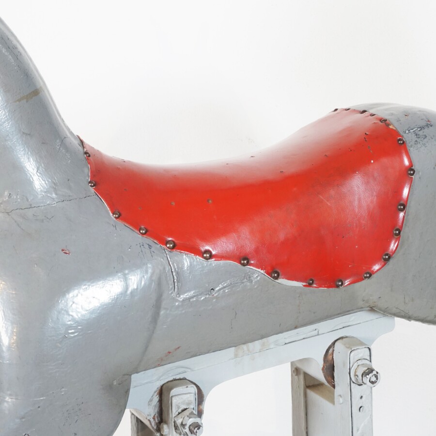 Cheval de manège, bois peint gris et noir, selle en cuir rouge, sur mécanisme à ressors laqué gris, L. 154 cm x l. 46 cm x H. 130 cm (écaillures, petites usures, fente à une oreille et une oreille manquante).