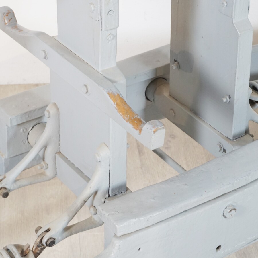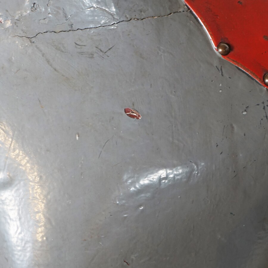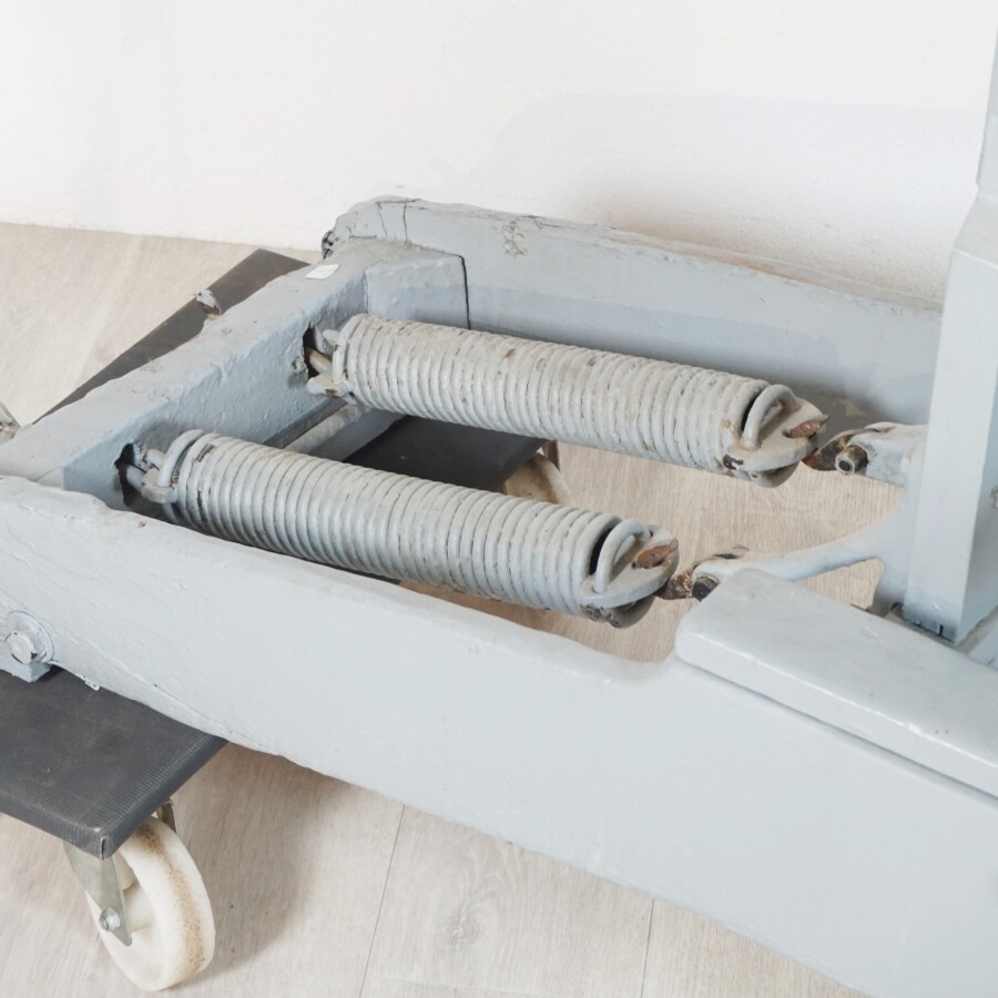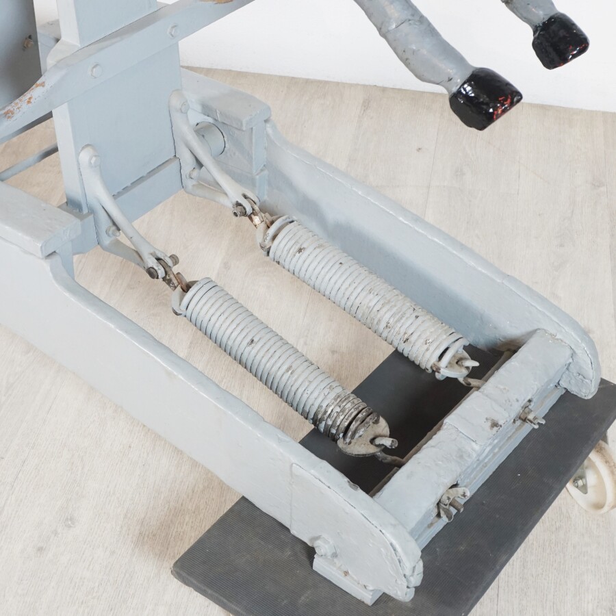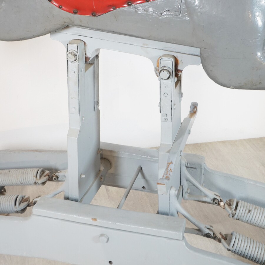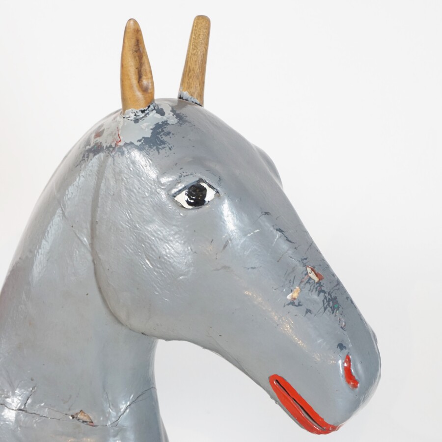 Cheval de manège, bois peint gris et noir, selle en cuir rouge, sur mécanisme à ressors laqué gris, L. 154 cm x l. 46 cm x H. 130 cm (écaillures, petites usures, fente à une oreille et une oreille manquante).