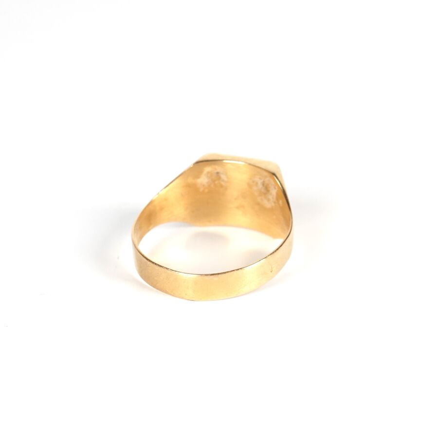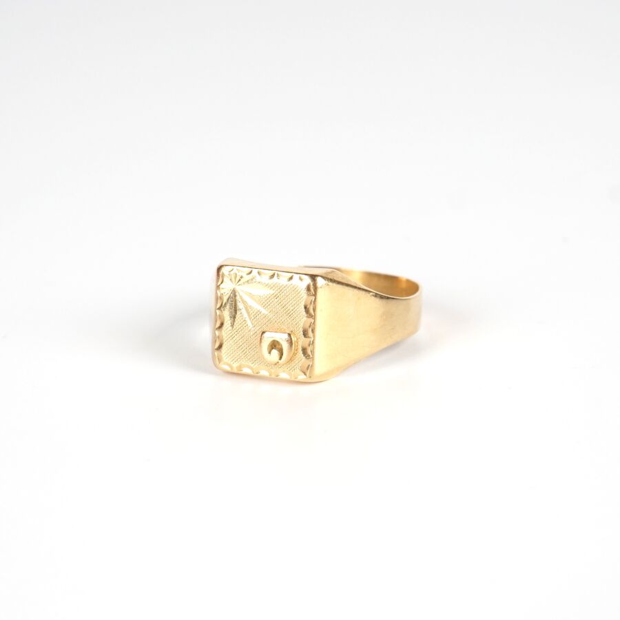 Chevalière en or jaune 18K (750/oo), le plateau orné d'un G sur fond guilloché, TDD. 62. Poids brut : 3.4 g environ.