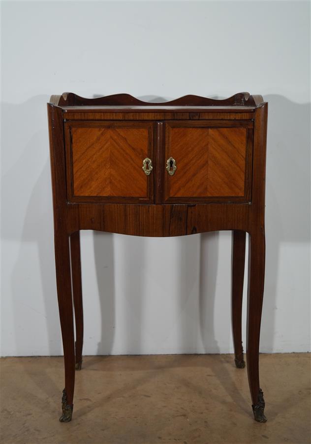 Chevet de style Louis XV en placage de bois de rose ouvrant à 2 petits vantaux découvrant un casier en façade et un tiroir sur le côté en ceinture, pieds galbés terminés par des sabots à décor rocaille, H. 74 cm, L. 49.5 cm, P. 32 cm