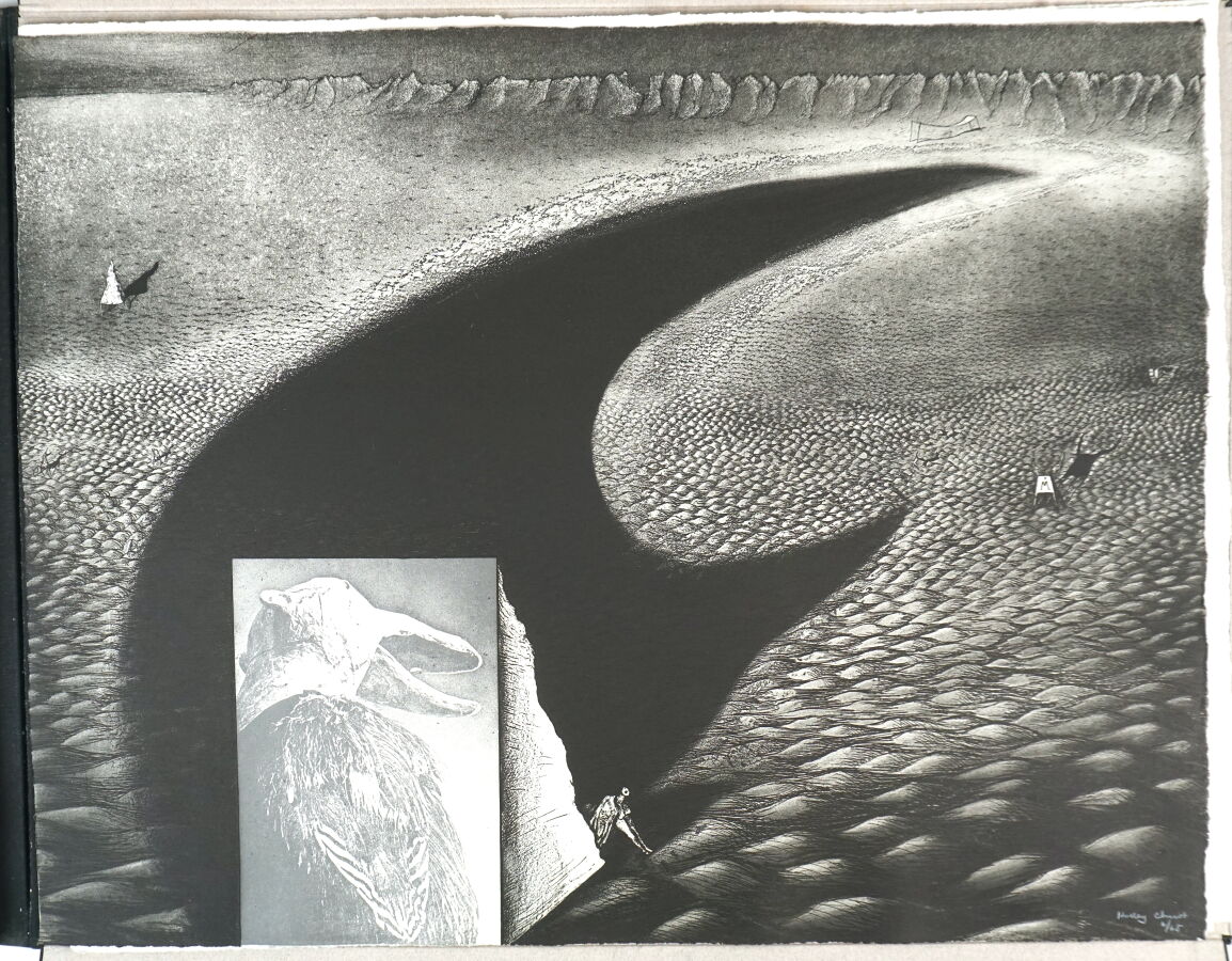 CHIROT (Holley) - Un Chant dans le Désert - Levallois ; Chez l'artiste, Paris ; Atelier Bicéphale, 1979 - 1 volume In folio oblong en feuilles sous chemise toilée noire à rabats illustrée d'1 large vignette couleurs contre collée au 1er plat reproduisant 1 photographie par S. Speiser de la Cantatrice, sculpture de l'artiste - 16 eaux-fortes et aquatintes de Holley Chirot , toutes signées et numérotées par l'artiste - Bon exemplaire numéroté sur vélin de Lana (n°6 sur 65, tirage total : 65 + V), signature autographe de l'artiste à la justification.