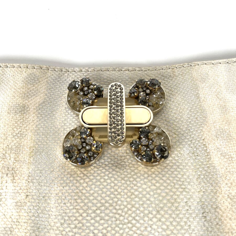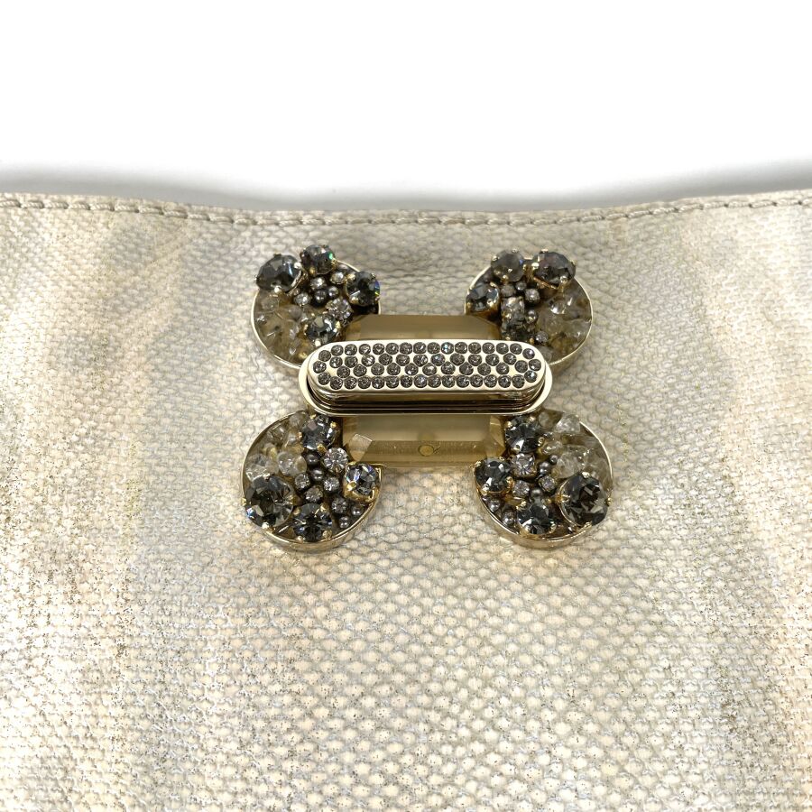 CHLOÉ : Pochette en cuir et peau façon lézard écrus et argentés, fermoir bijou doré serti de strass, munie d'une poche arrière à rabat et d'un intérieur doublé de cuir clair avec petite poche plaquée, fermeture par patte rigide. H 18 cm. Long. 35 cm. (trace d'usages, usure légère du fermoir et du cuir intérieur).