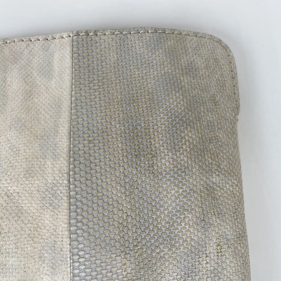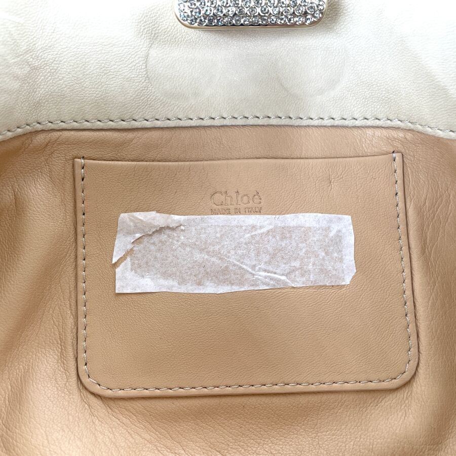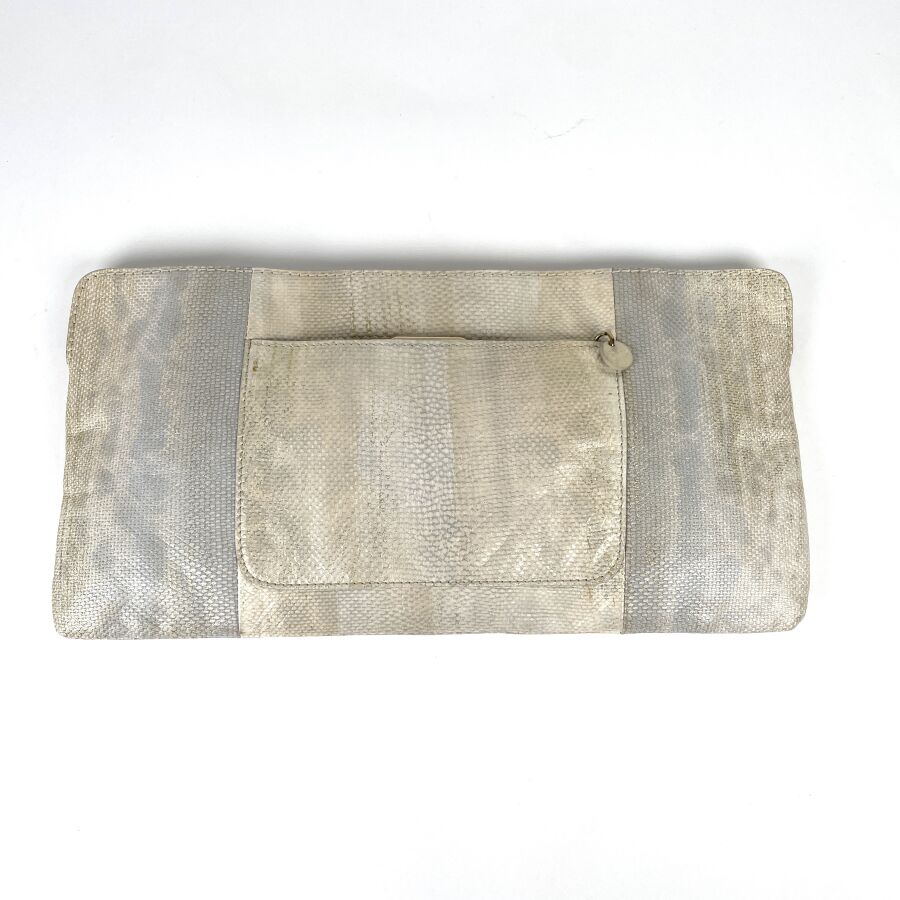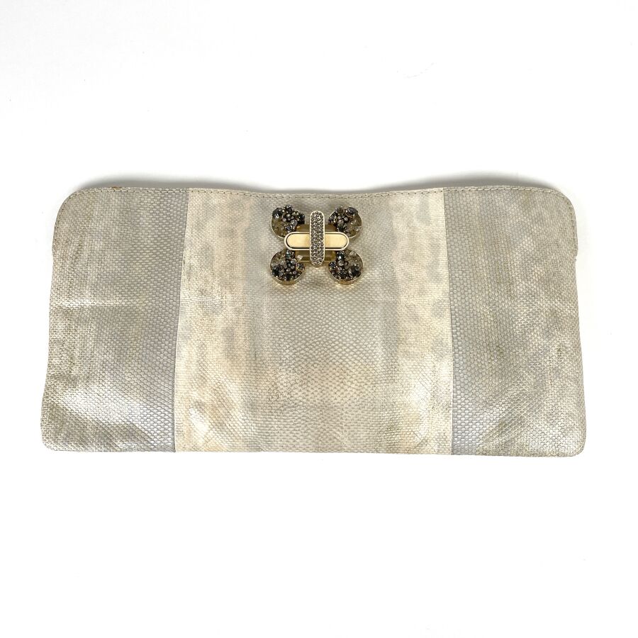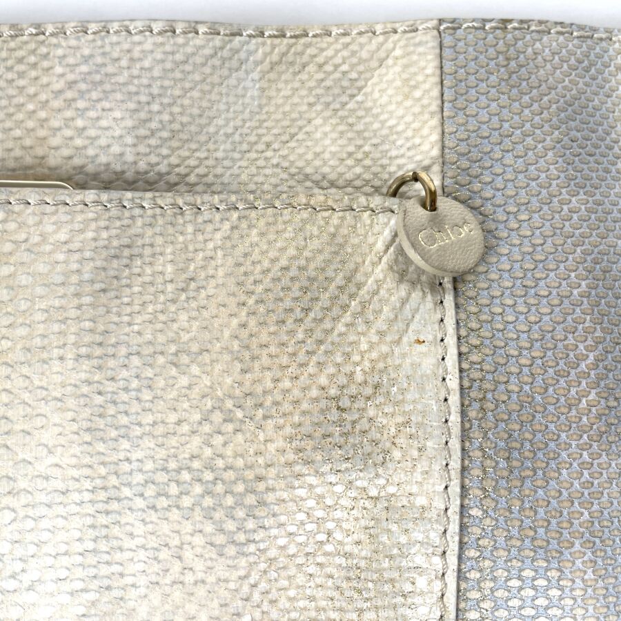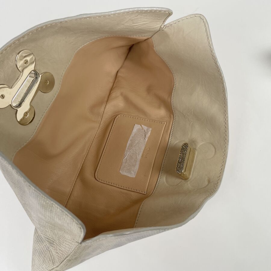 CHLOÉ : Pochette en cuir et peau façon lézard écrus et argentés, fermoir bijou doré serti de strass, munie d'une poche arrière à rabat et d'un intérieur doublé de cuir clair avec petite poche plaquée, fermeture par patte rigide. H 18 cm. Long. 35 cm. (trace d'usages, usure légère du fermoir et du cuir intérieur).