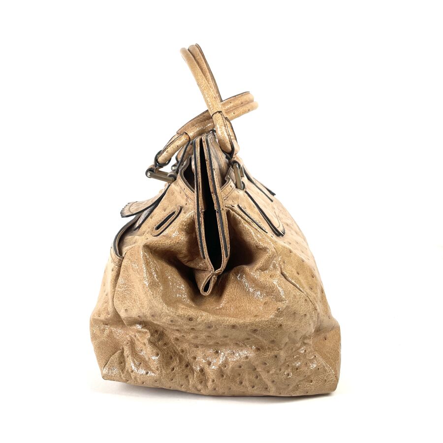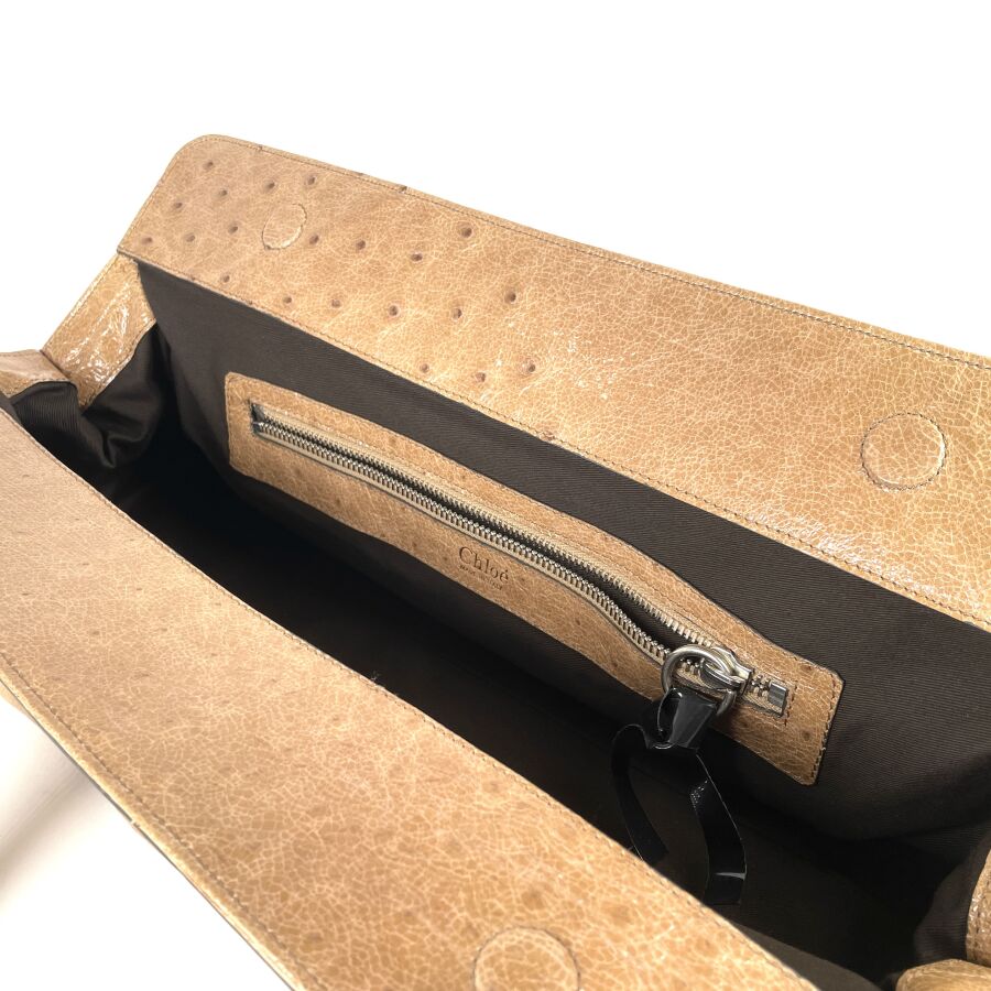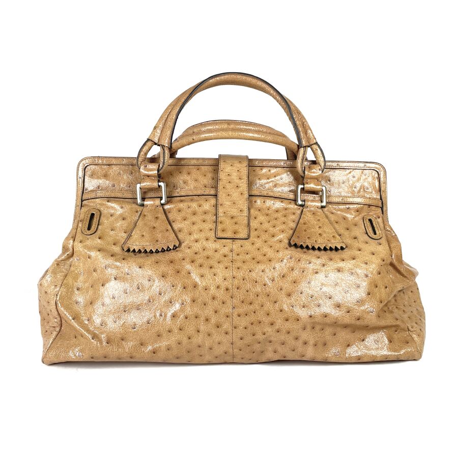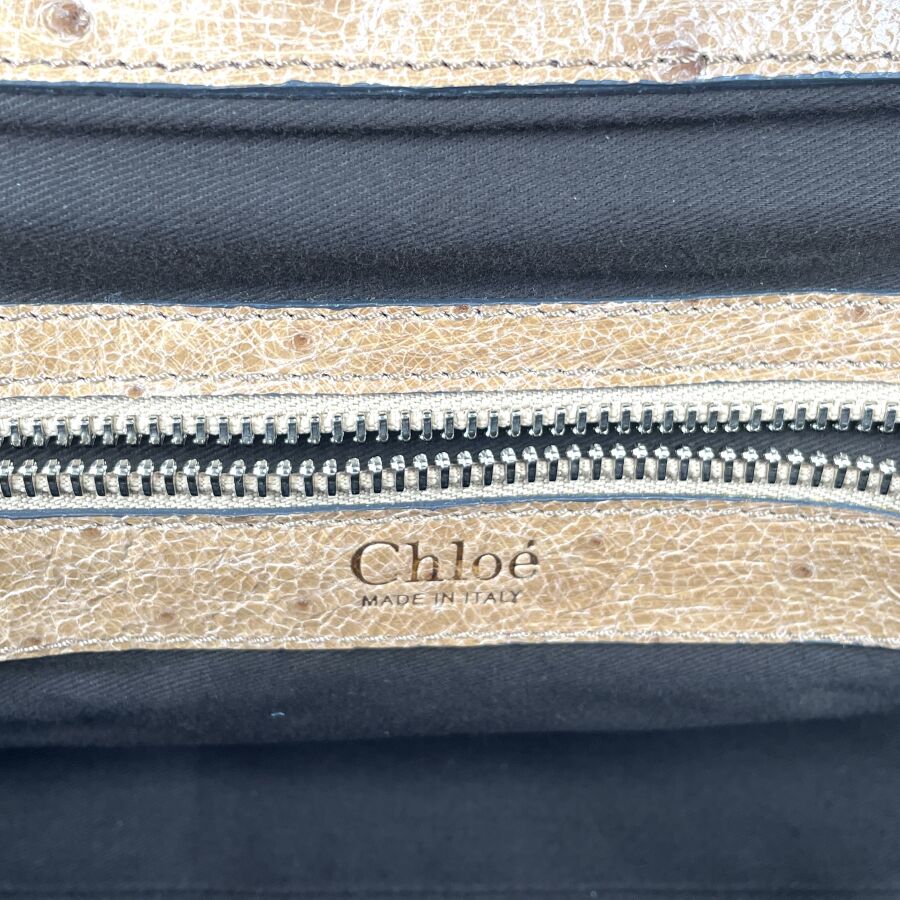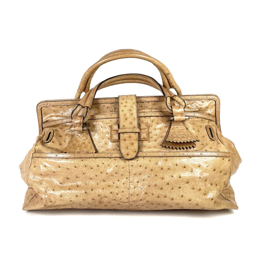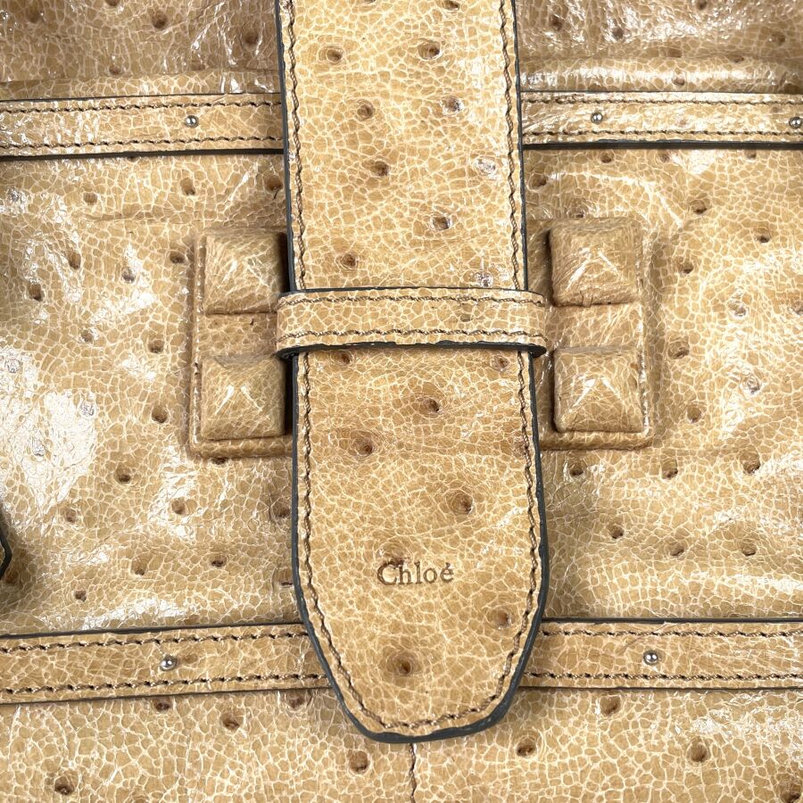 CHLOÉ : Sac à main en cuir embossé façon autruche beige, muni de deux anses arrondies, d'un rabat supérieur à patte centrale avec boucle, garnitures métalliques ton or, intérieur doublé d'une toile foncée avec poche zippée, fermeture par languette sous un pendentif en cuir. H. 28 cm. Long. 49 cm. Larg. 25.5 cm. (cuir légèrement marqué par endroits)