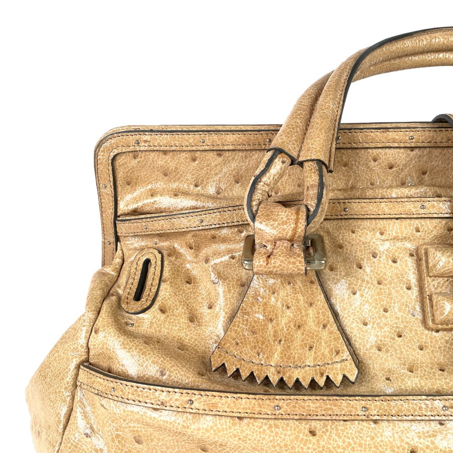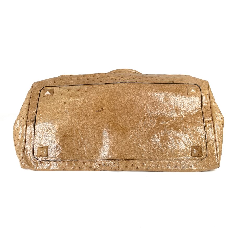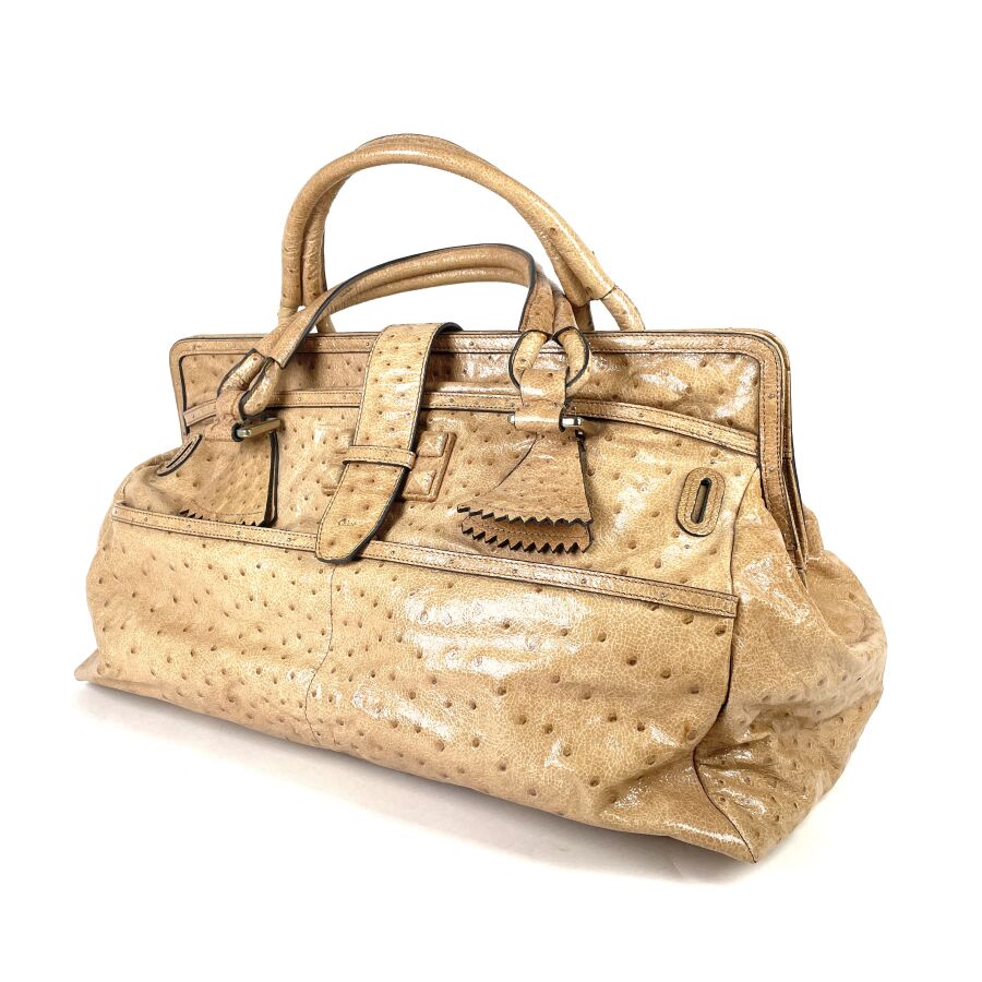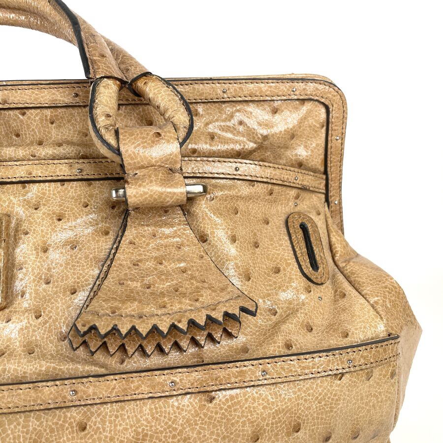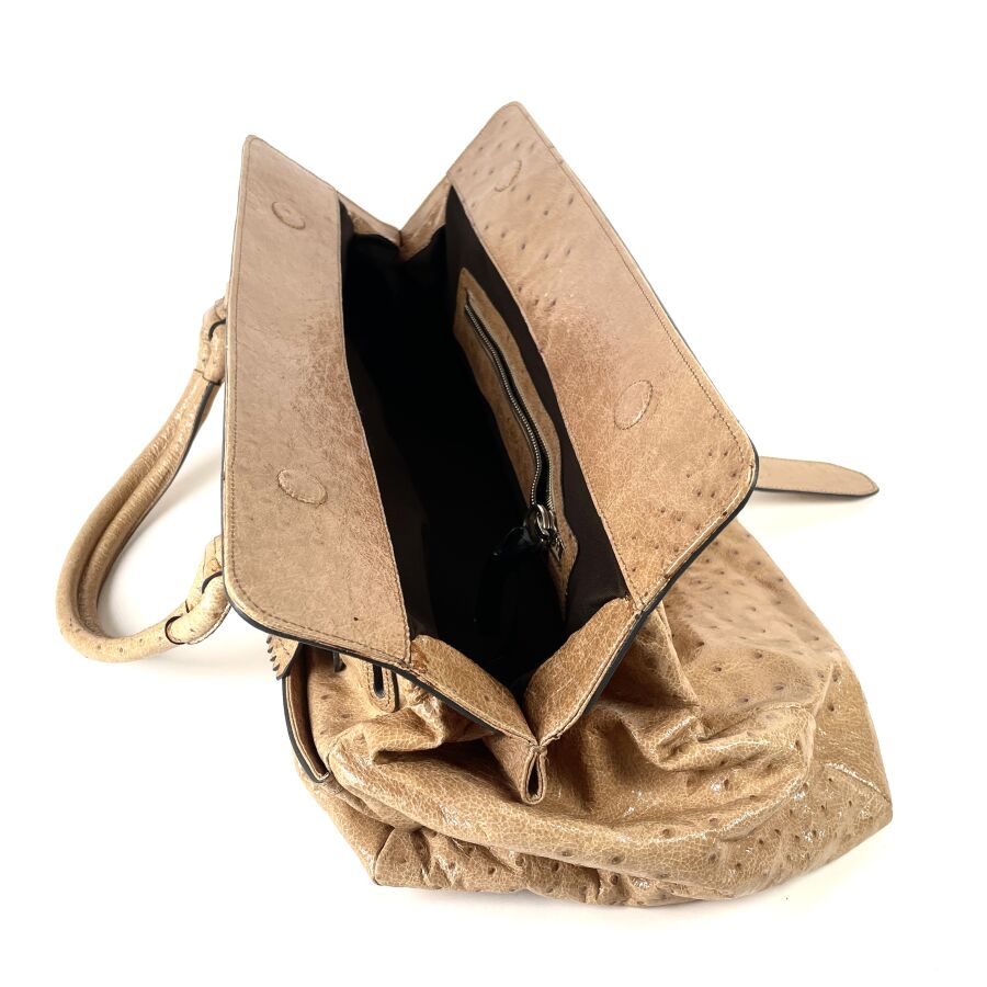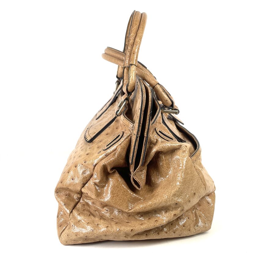 CHLOÉ : Sac à main en cuir embossé façon autruche beige, muni de deux anses arrondies, d'un rabat supérieur à patte centrale avec boucle, garnitures métalliques ton or, intérieur doublé d'une toile foncée avec poche zippée, fermeture par languette sous un pendentif en cuir. H. 28 cm. Long. 49 cm. Larg. 25.5 cm. (cuir légèrement marqué par endroits)