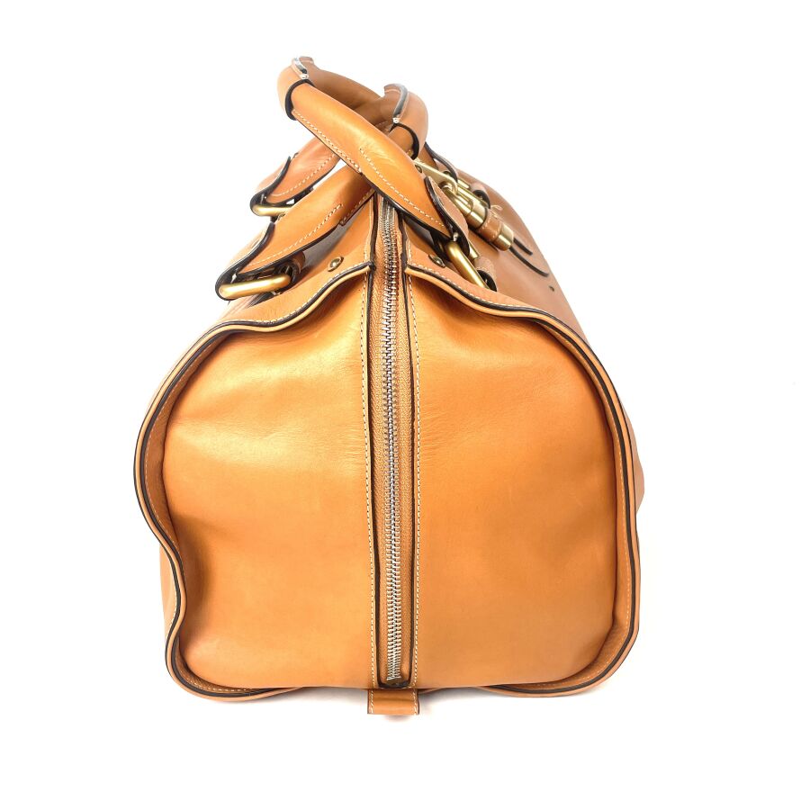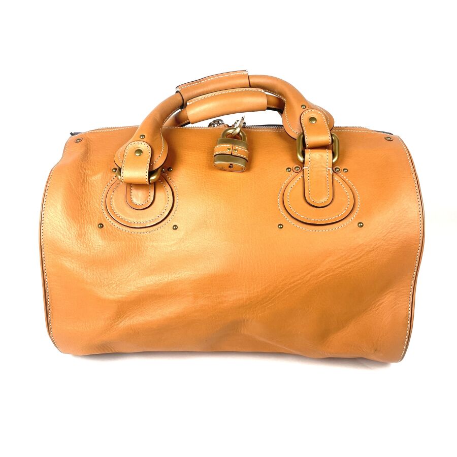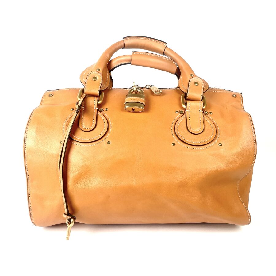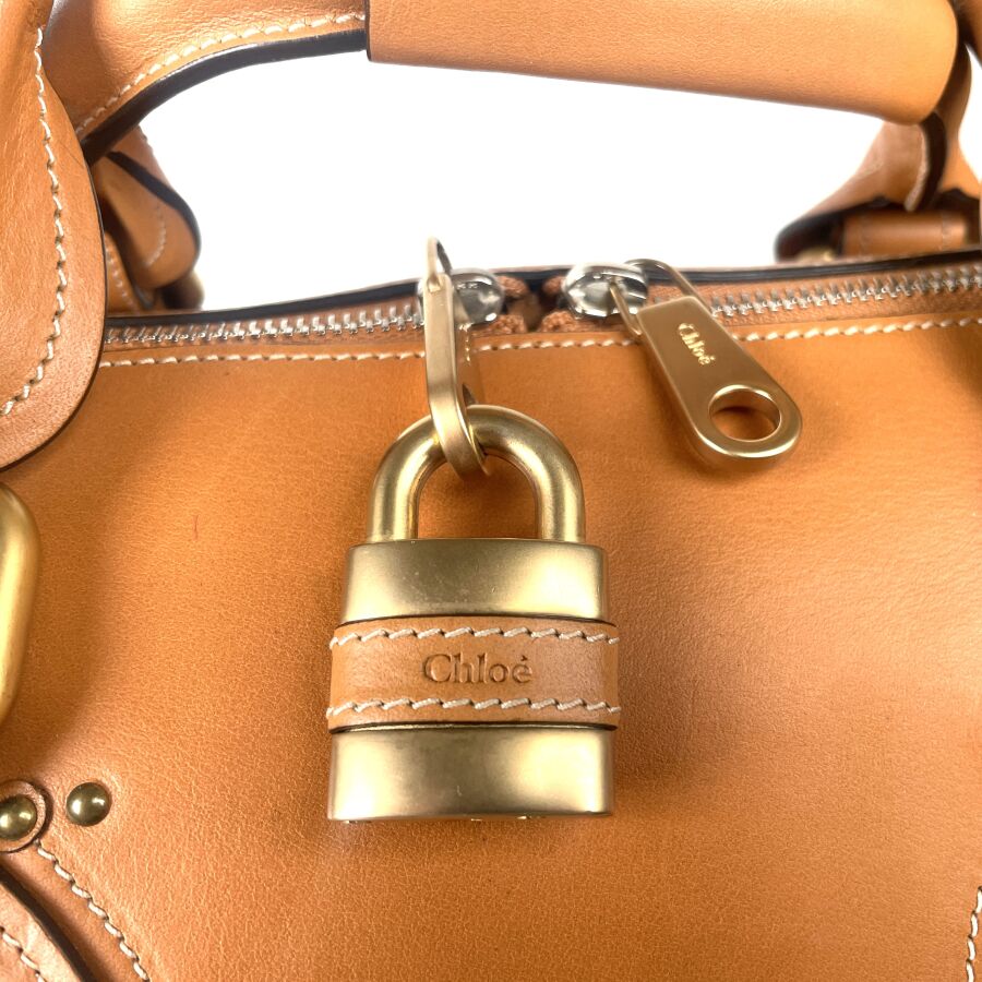 CHLOÉ : Sac modèle " Aurore " en cuir camel, muni de deux anses, garnitures métalliques dorées comprenant boucles latérales, rivets décoratifs, anneaux d'attache et petit cadenas décoratif Chloé avec sa clé, l'intérieur doublé d'un tissu clair avec poches plaquées, fermeture à glissière supérieure signée. H.: 21 cm. Long. 34 cm. Larg. 20 cm. (usures du cuir par endroit, petite trace au niveau des anses).
