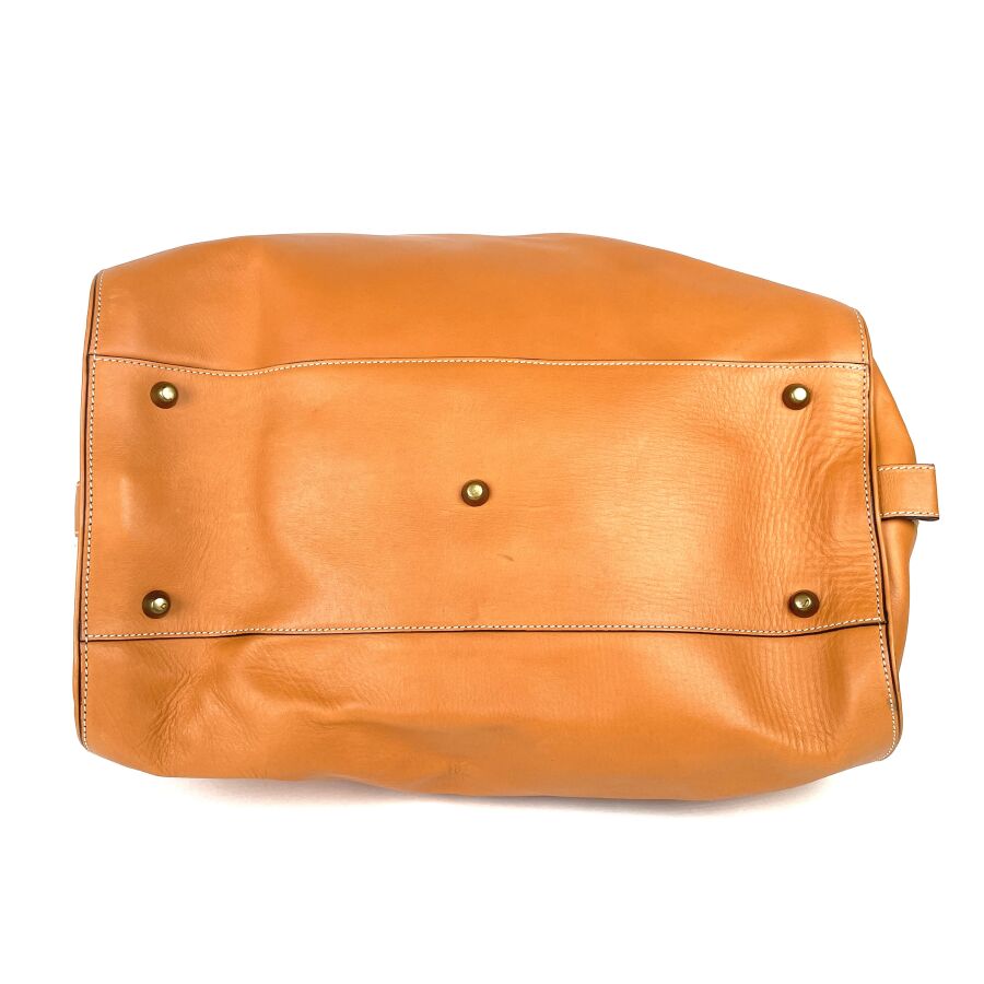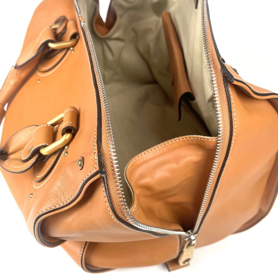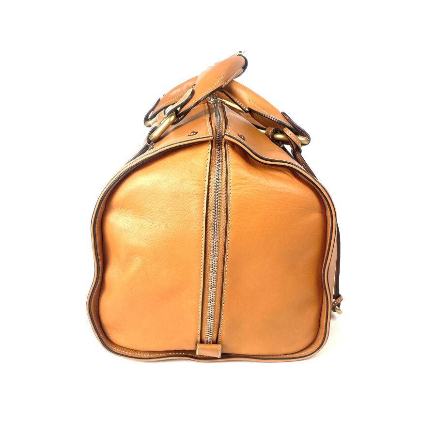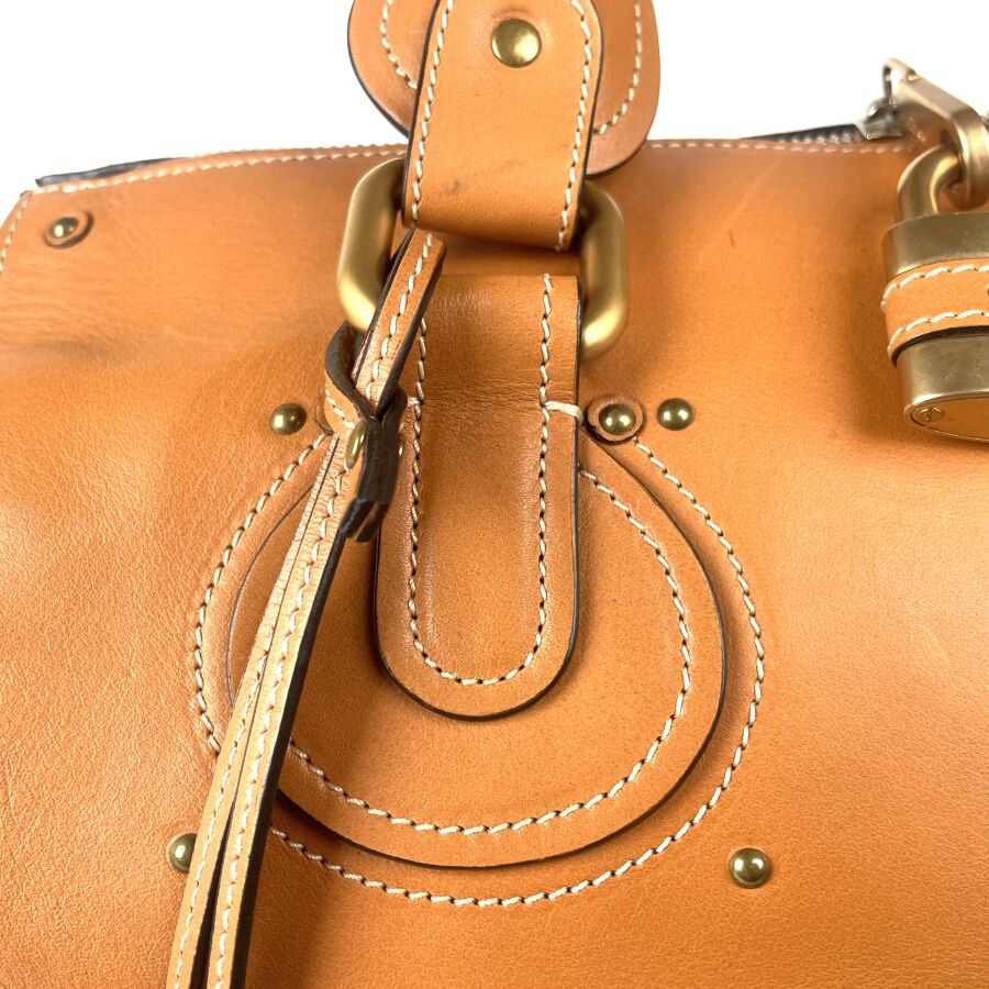 CHLOÉ : Sac modèle " Aurore " en cuir camel, muni de deux anses, garnitures métalliques dorées comprenant boucles latérales, rivets décoratifs, anneaux d'attache et petit cadenas décoratif Chloé avec sa clé, l'intérieur doublé d'un tissu clair avec poches plaquées, fermeture à glissière supérieure signée. H.: 21 cm. Long. 34 cm. Larg. 20 cm. (usures du cuir par endroit, petite trace au niveau des anses).