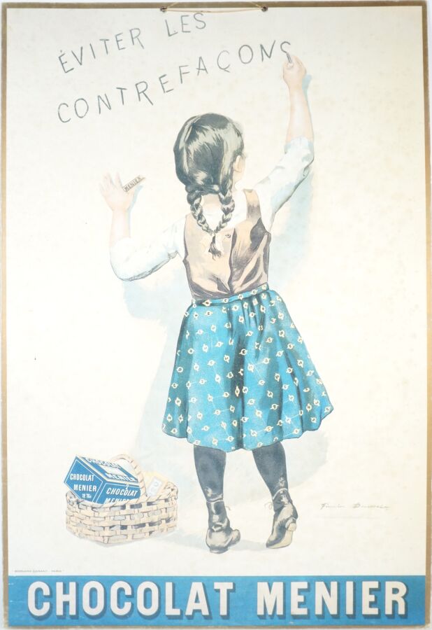 CHOCOLAT MENIER : Evitez les contrefaçons, carton publicitaire d'après Firmin Bouisset, éd. Bernard Carant, Dim. Totale : 62 x 42.4 cm (usures, taches).