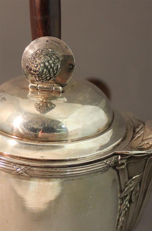 Chocolatière en argent poinçon Minerve, le bec à décor de côtes et feuillages, frise de joncs rubannés, la prise figurant une pomme de pin. Poignée en bois tourné, avec son moussoir en bois. Haut. : 21 cm. Poids brut : 483 g environ.