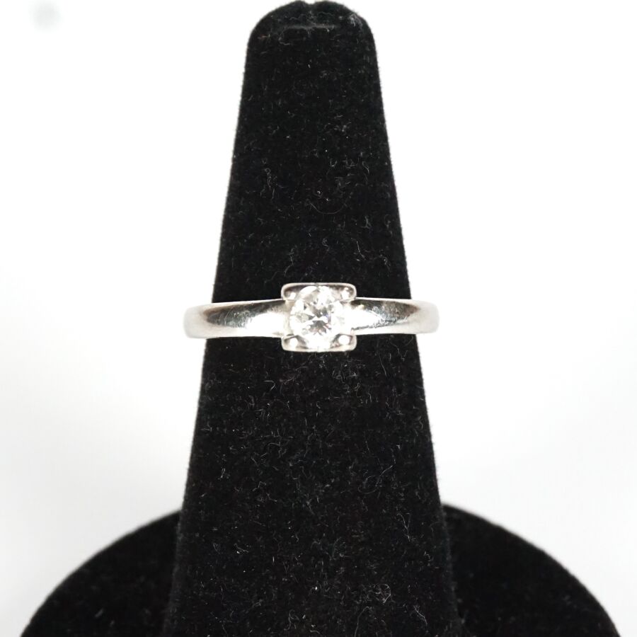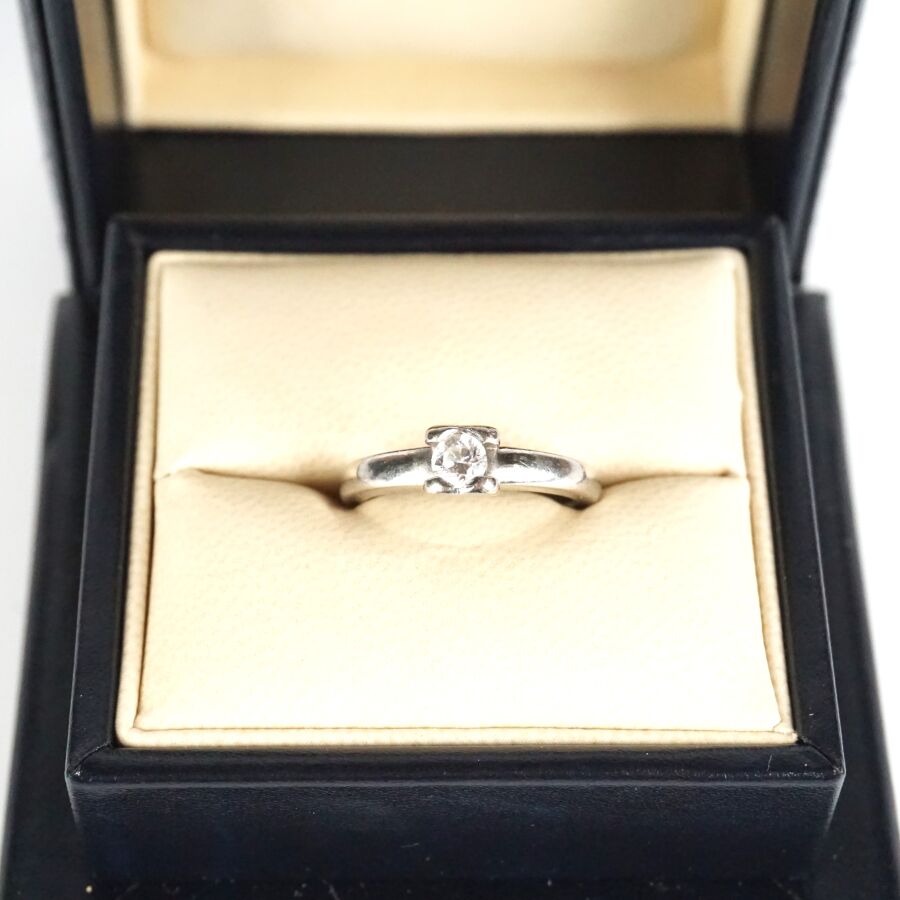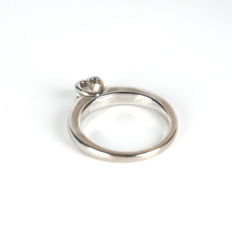 CHOPARD : "Chopard For Love", Solitaire en platine (850/oo) sertie d'un diamant taille brillant calibrant 0.31 ct environ, signée et numérotée, n° de série 2641022, présentée dans son écrin d'origine et sa surboîte, TDD. 53/53.5. Poids brut : 5.6 g environ.