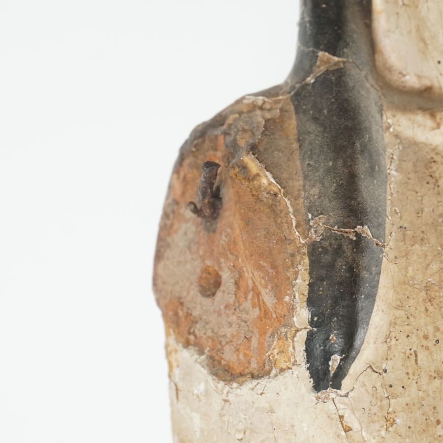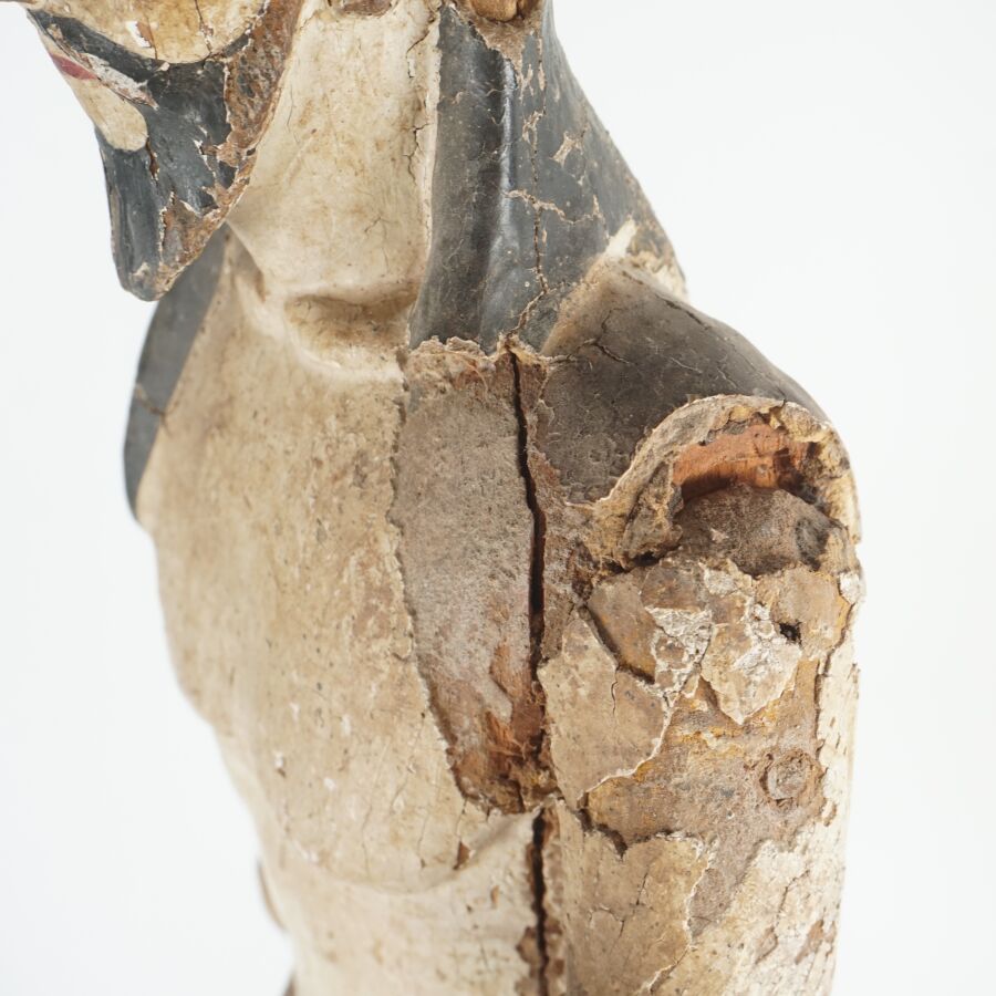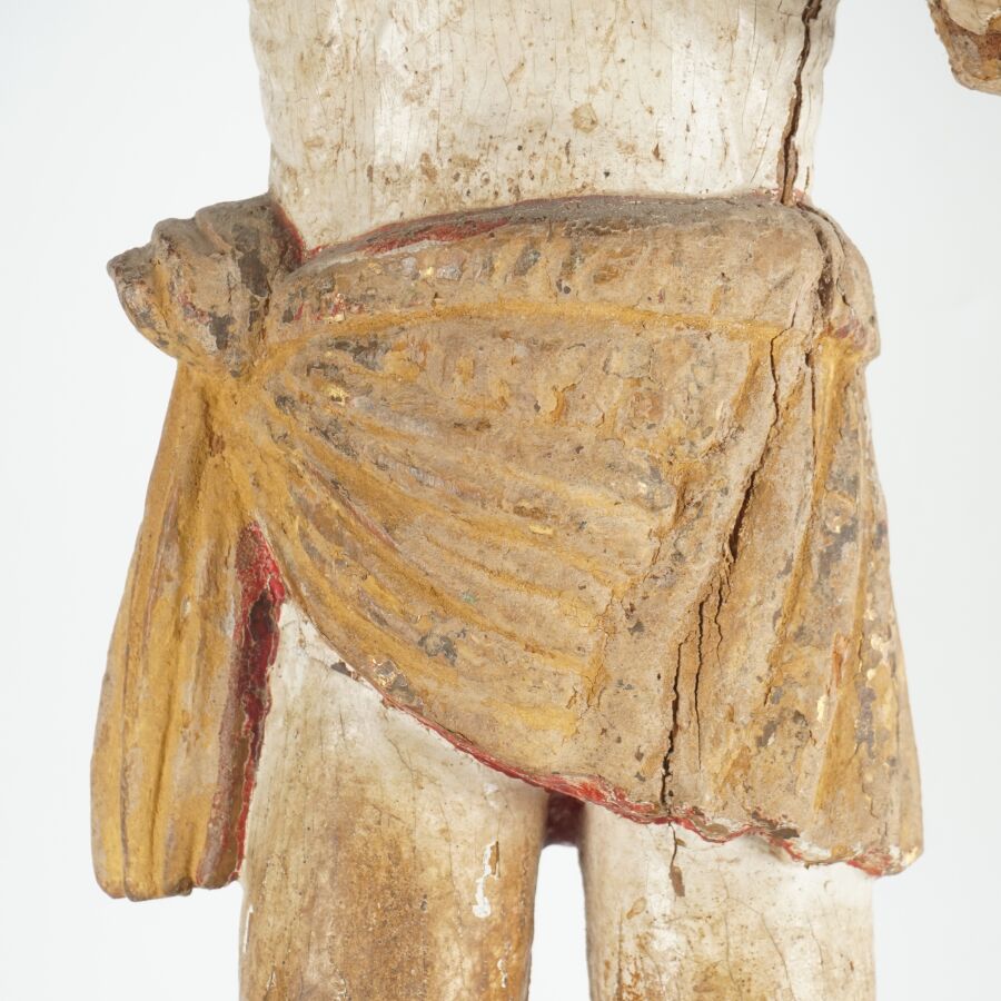 Christ en bois sculpté, traces de polychromie, probablement Amérique du sud, 19ème siècle, H. 62.5 cm (manque un bras, le second à refixer, écaillures et manques).