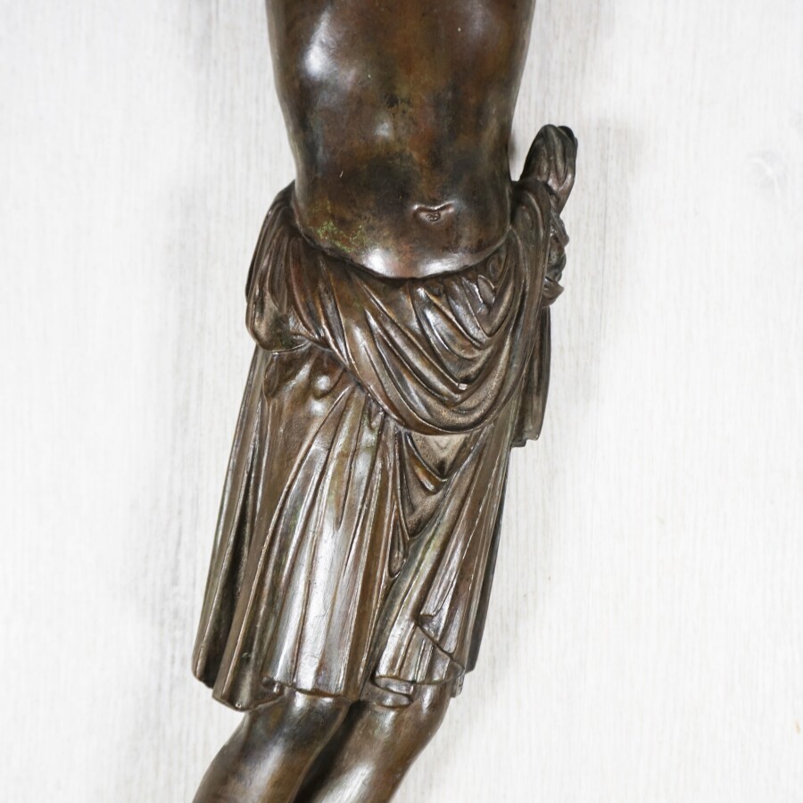 Christ en croix, sculpture en bronze finement ciselé à patine brun-vert, 73 x 67 cm (quelques usures à la patine, jeu à l'assemblage du bras droit).