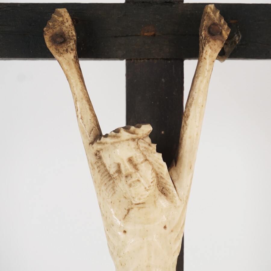 Christ Janséniste en os sculpté, présentée sur sa croix en bois, 20e siècle, H. Totale : 37 cm, H. Christ : 16.5 cm (petits manques, usures).