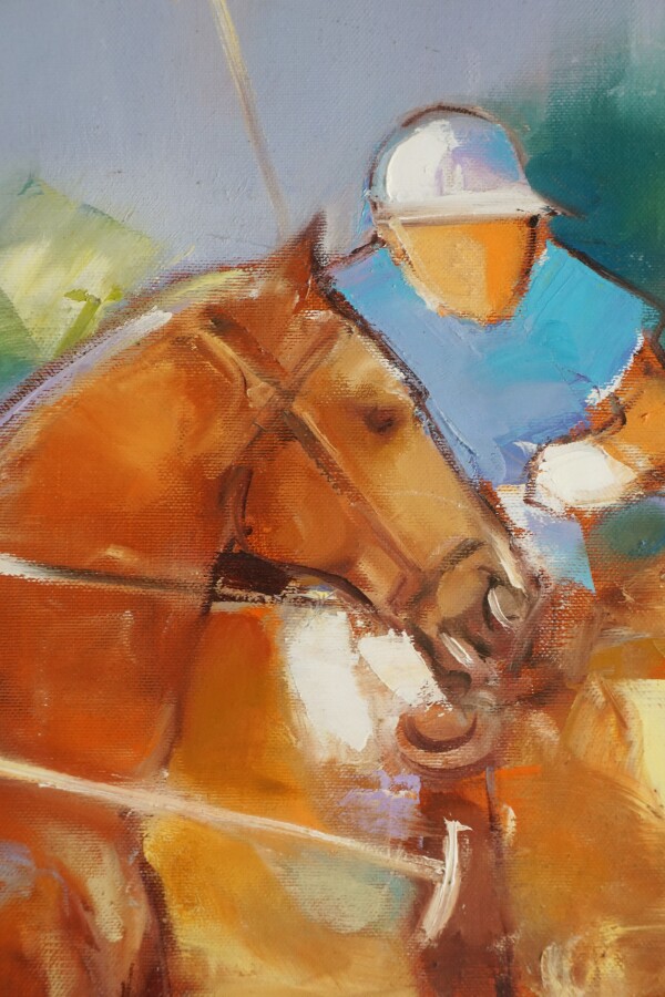 Christian BARON (1948), "Joueurs de polo", huile sur toile, signée en bas à droite, 73 x 60 cm.