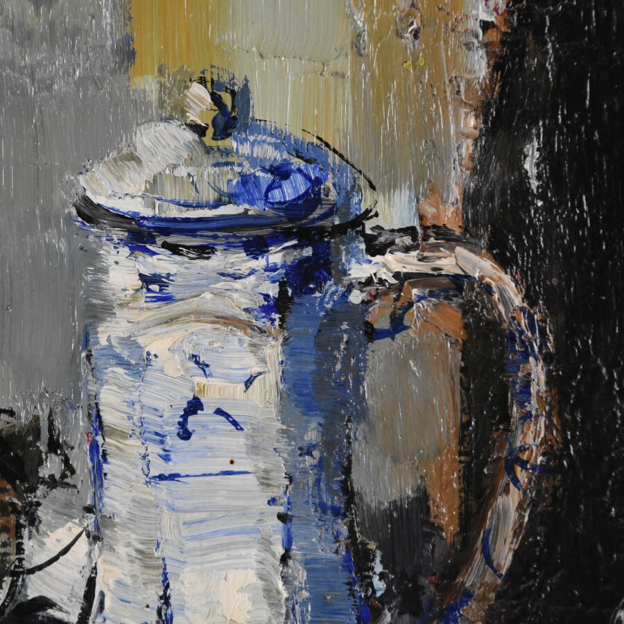 Christian DECATOIRE (XXe), "Nature-morte au raisin et au moulin à café", huile sur toile signée en bas à droite, 38.5 x 54 cm.