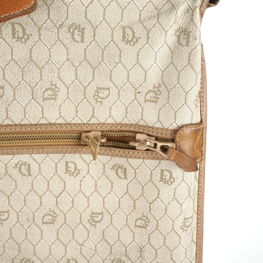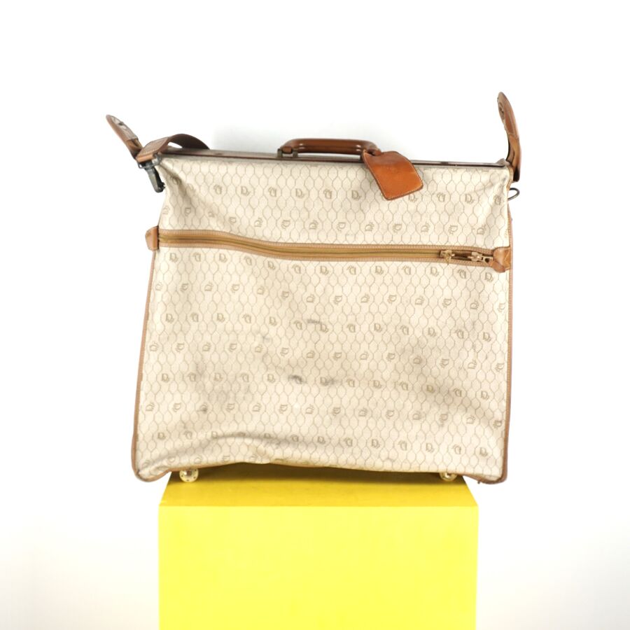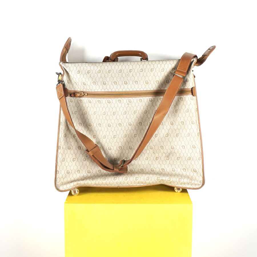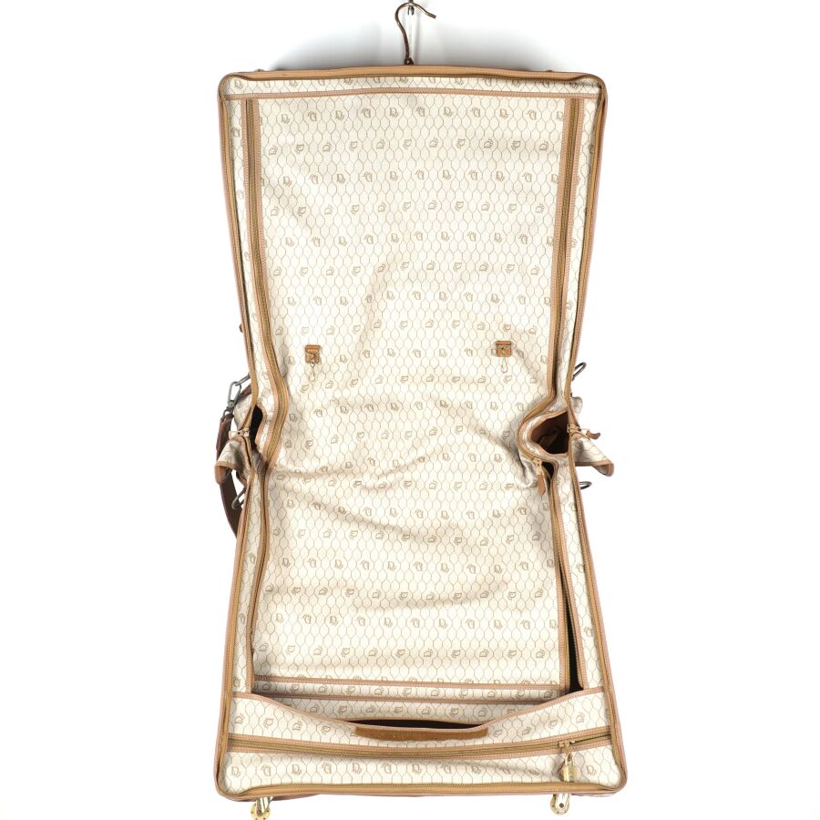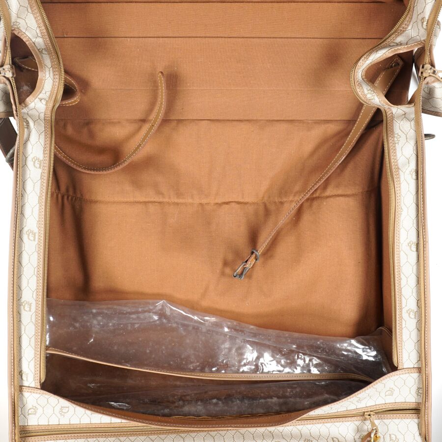 CHRISTIAN DIOR - BAGAGES : Housse de vêtements formant valise, cuir marron et toile Jacques oblique monogrammée sur fond beige, fermeture de la valise par une fermeture zippée, deux pochettes extérieures zippées, dépliant et ouvrant sur la housse à fermeture zippée, anse en cuir brun pour un porté main et bandoulière en cuir pour un porté épaule, intérieur marron, sangles et accroches intérieures, avec un porte-carte non logoté, sur roulettes, avec un crochet dessous pour une attache "penderie", Dim. Plié (format valise) : 47.5 x 55 x 26 cm environ. L. Housse (dépliée) : 107 cm (quelques usures, manque une languette à l'une des fermetures zippées, rouille à la bijouterie en métal).
