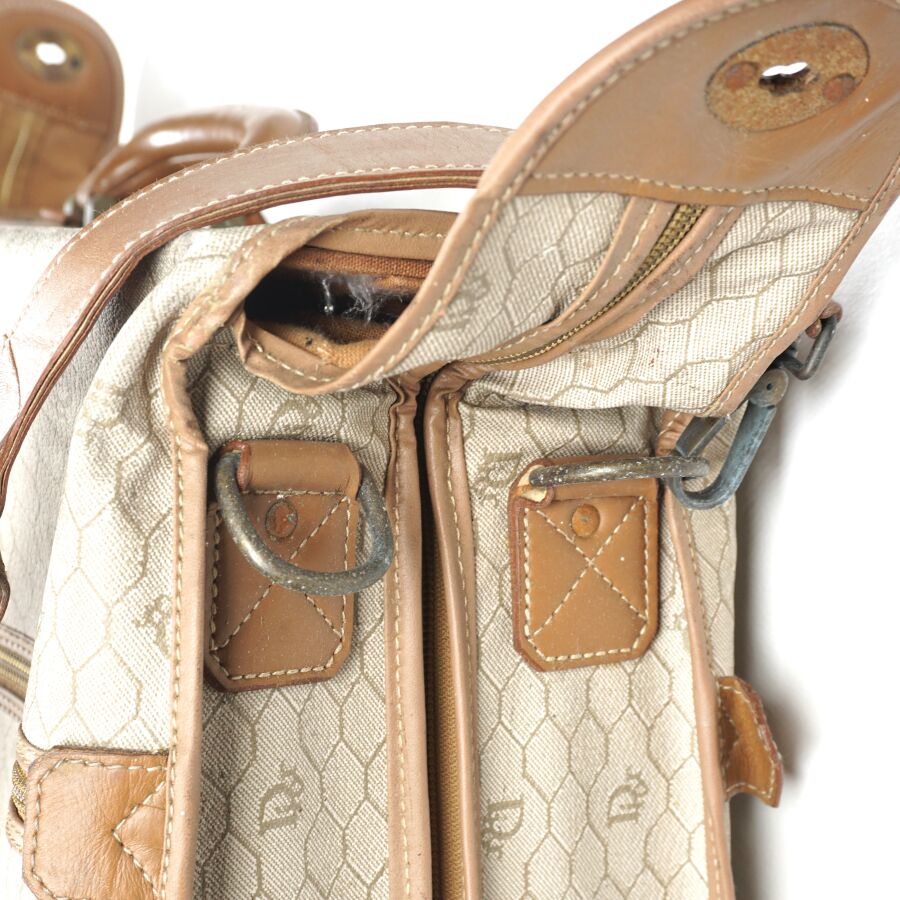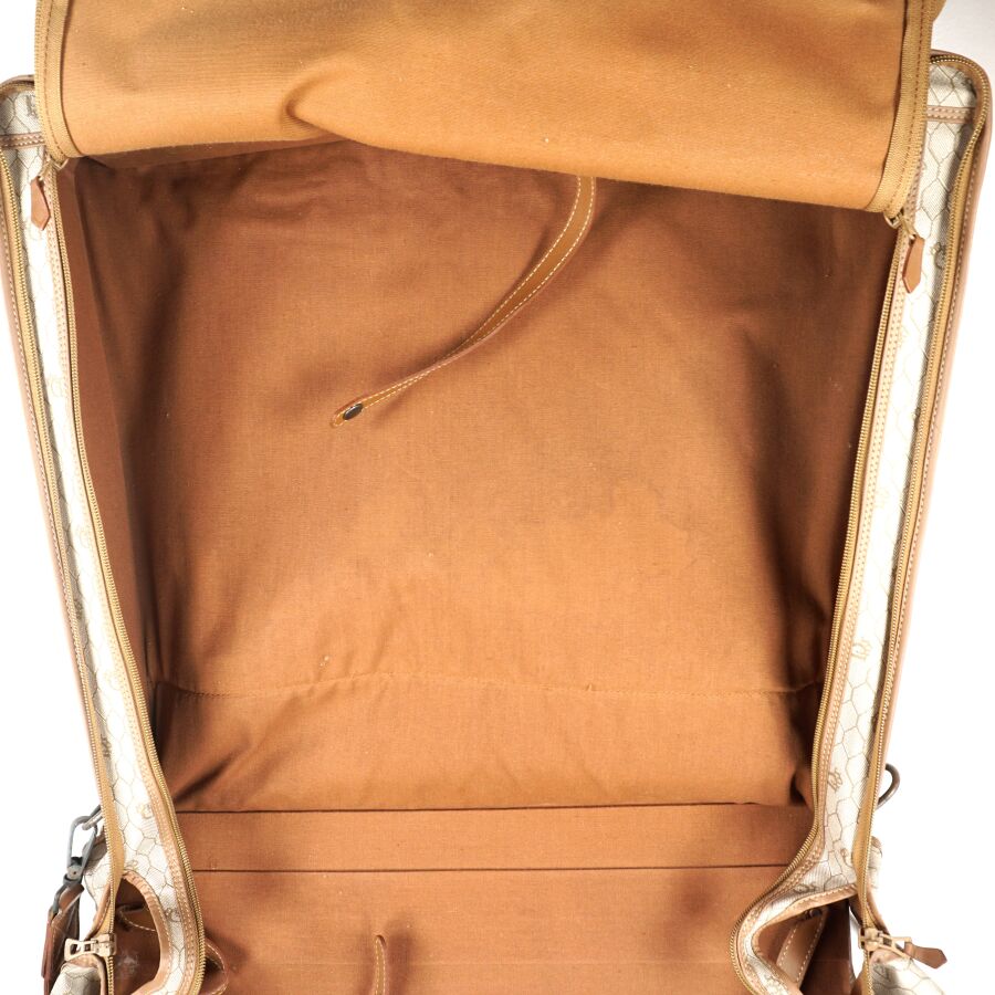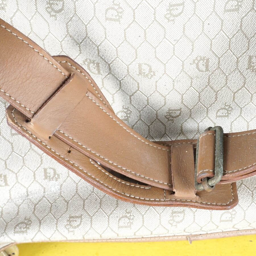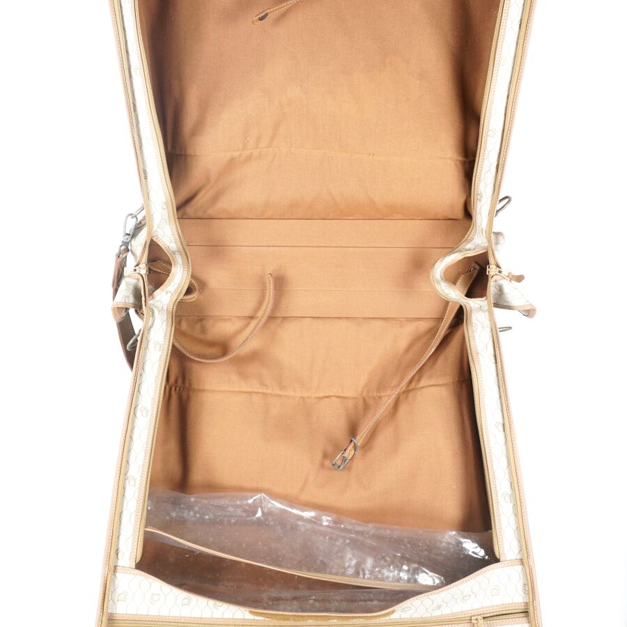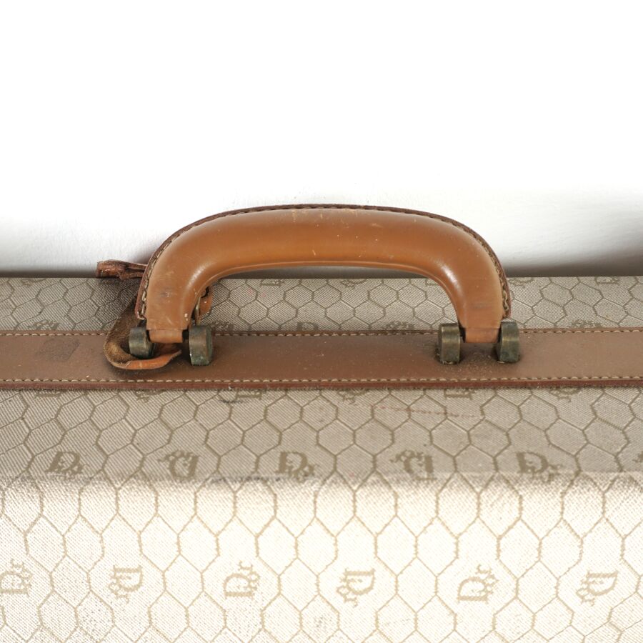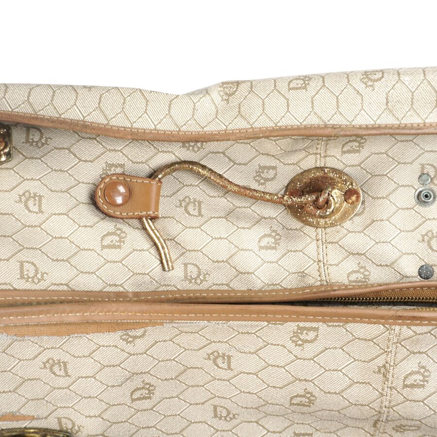 CHRISTIAN DIOR - BAGAGES : Housse de vêtements formant valise, cuir marron et toile Jacques oblique monogrammée sur fond beige, fermeture de la valise par une fermeture zippée, deux pochettes extérieures zippées, dépliant et ouvrant sur la housse à fermeture zippée, anse en cuir brun pour un porté main et bandoulière en cuir pour un porté épaule, intérieur marron, sangles et accroches intérieures, avec un porte-carte non logoté, sur roulettes, avec un crochet dessous pour une attache "penderie", Dim. Plié (format valise) : 47.5 x 55 x 26 cm environ. L. Housse (dépliée) : 107 cm (quelques usures, manque une languette à l'une des fermetures zippées, rouille à la bijouterie en métal).