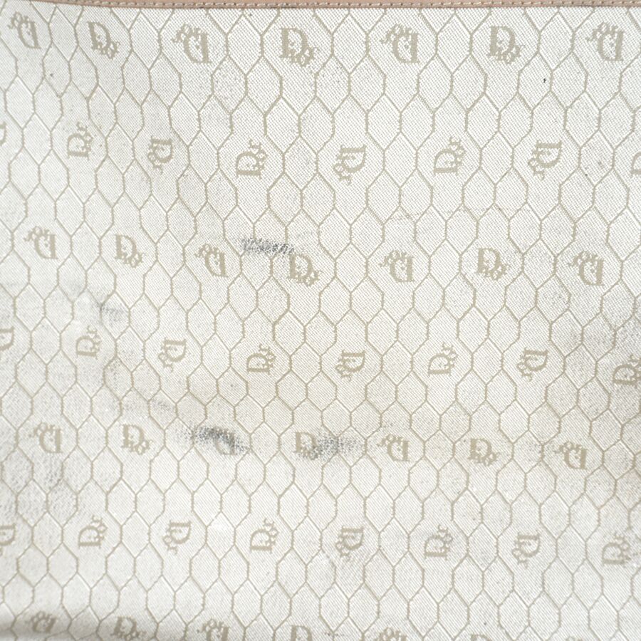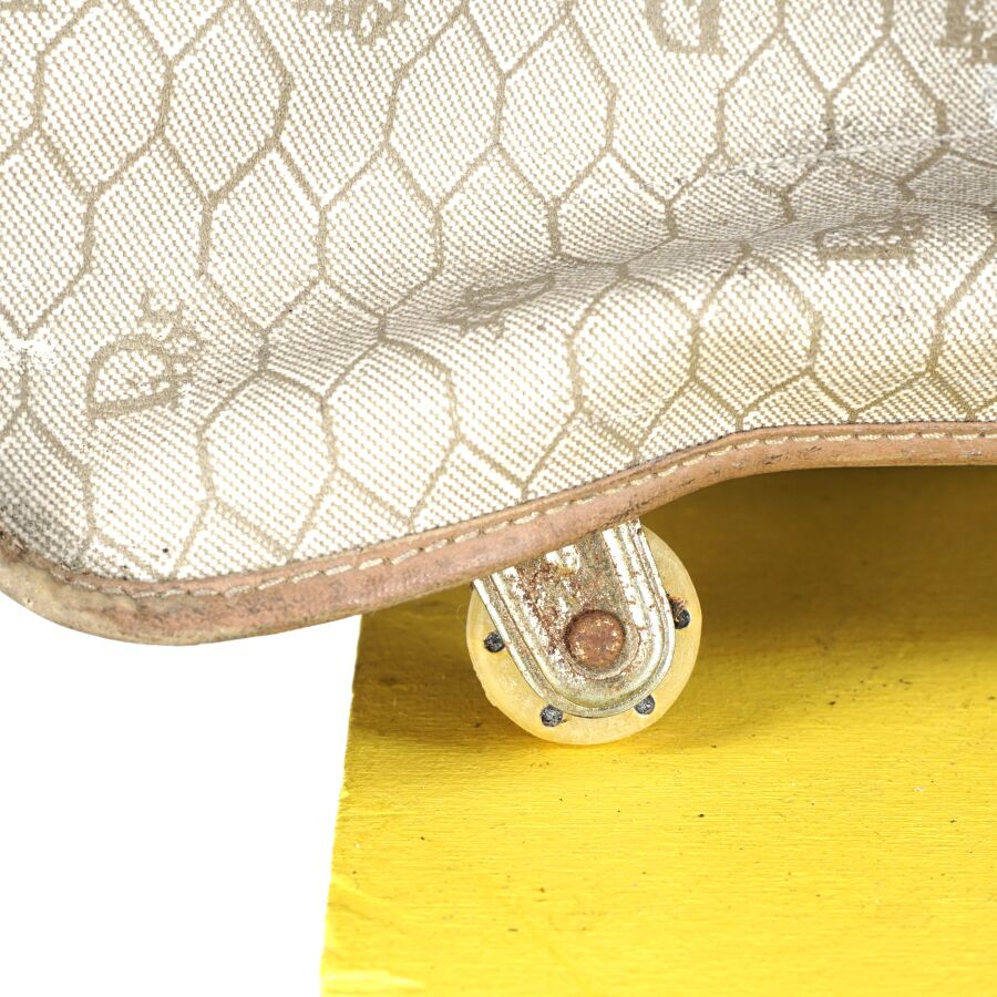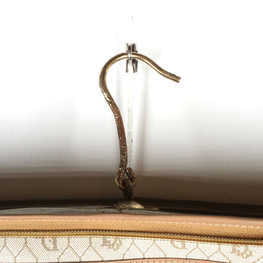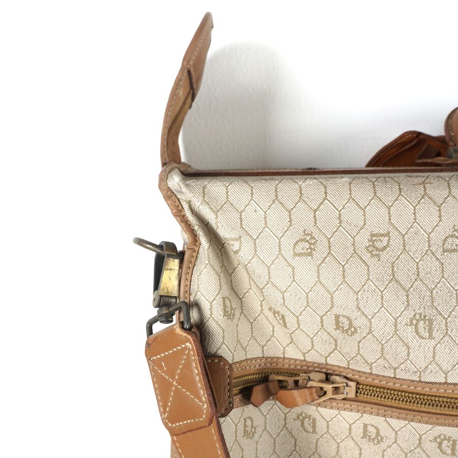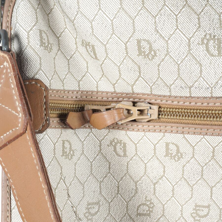 CHRISTIAN DIOR - BAGAGES : Housse de vêtements formant valise, cuir marron et toile Jacques oblique monogrammée sur fond beige, fermeture de la valise par une fermeture zippée, deux pochettes extérieures zippées, dépliant et ouvrant sur la housse à fermeture zippée, anse en cuir brun pour un porté main et bandoulière en cuir pour un porté épaule, intérieur marron, sangles et accroches intérieures, avec un porte-carte non logoté, sur roulettes, avec un crochet dessous pour une attache "penderie", Dim. Plié (format valise) : 47.5 x 55 x 26 cm environ. L. Housse (dépliée) : 107 cm (quelques usures, manque une languette à l'une des fermetures zippées, rouille à la bijouterie en métal).