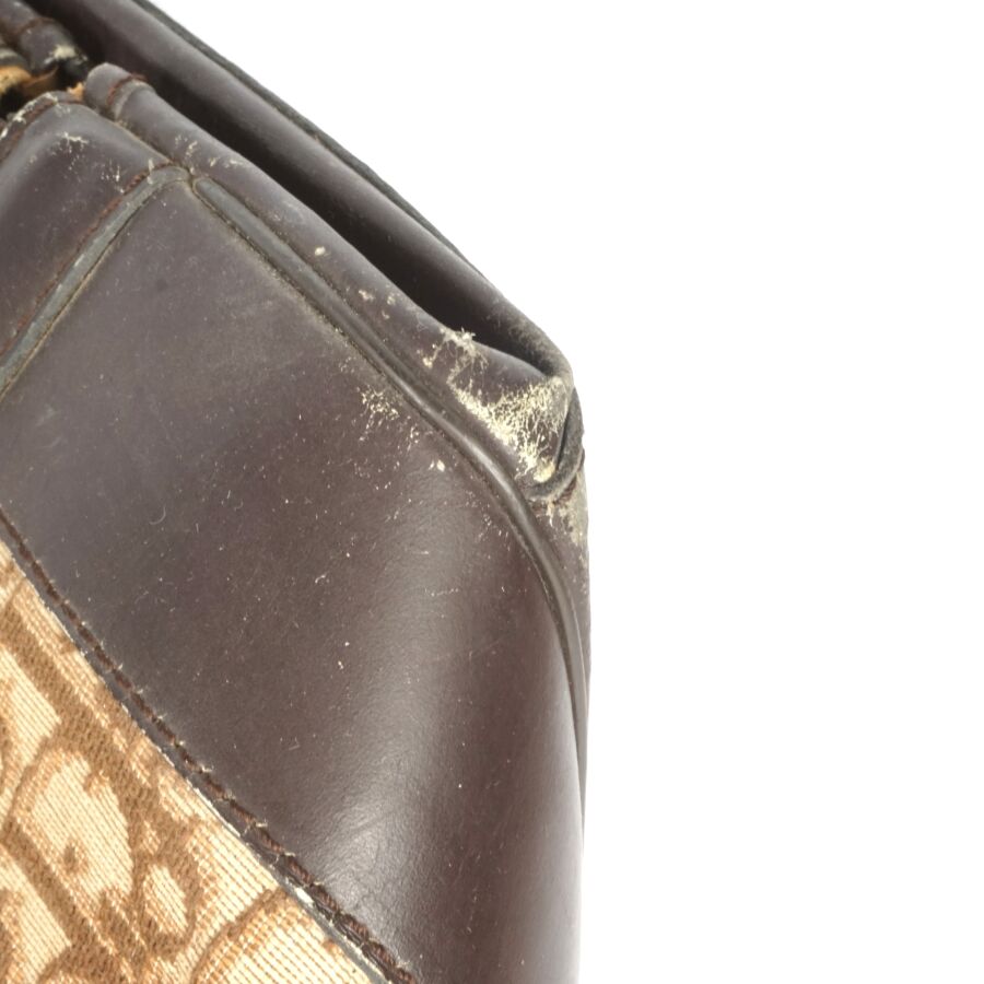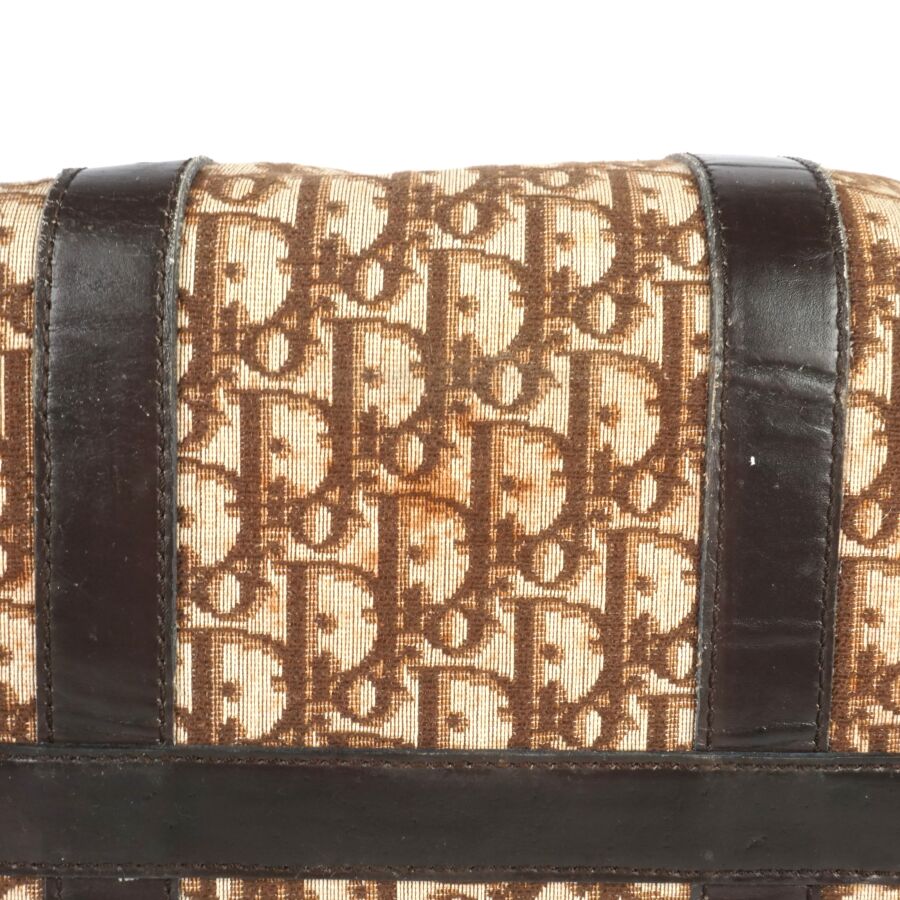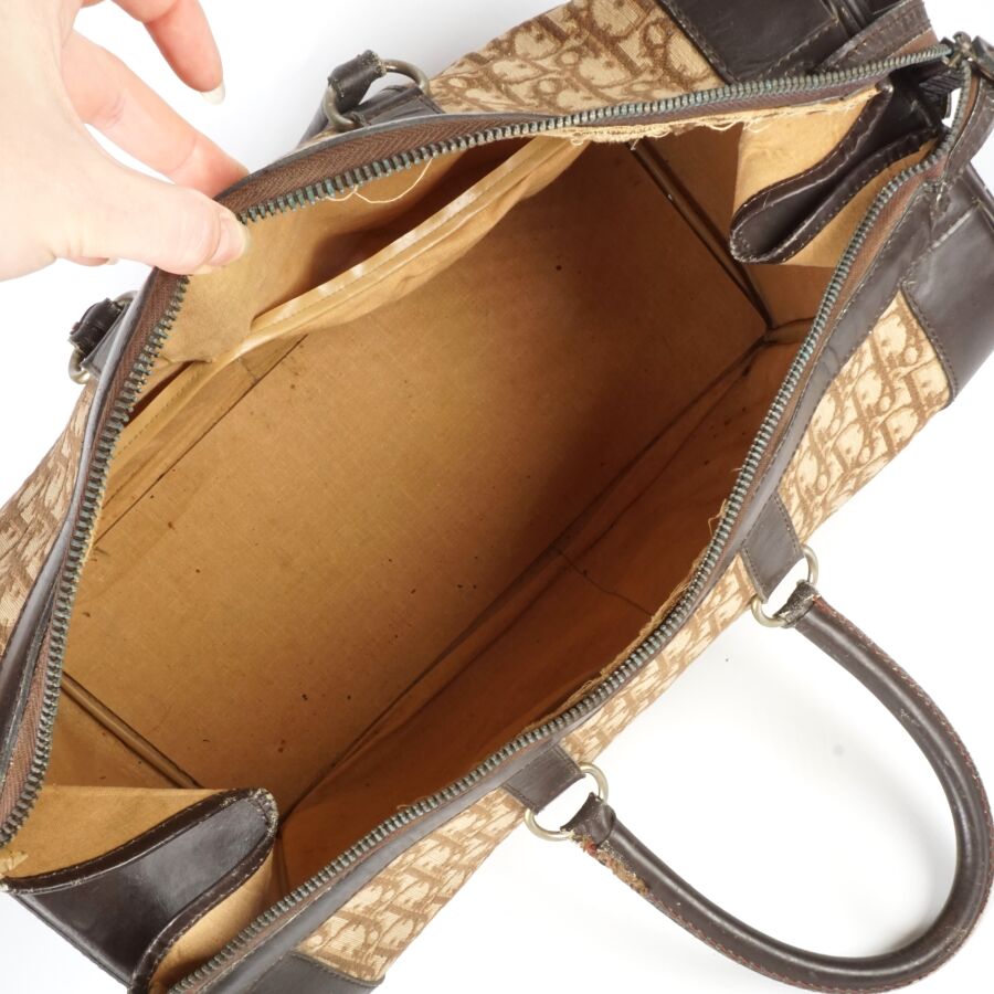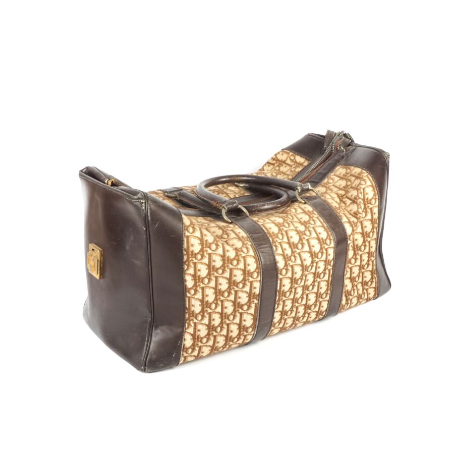 CHRISTIAN DIOR - BAGAGES : Sac de voyage en cuir brun foncé et toile jacquard oblique monogrammée sur fond beige, deux anses, fermeture zippée sur le dessus, système de fermeture latérale par clé, serrure en métal doré logotée "CD", intérieure beige avec quatre pochettes, Dim. 23.5 x 45 x 24 cm (usures, traces, manque la clé).