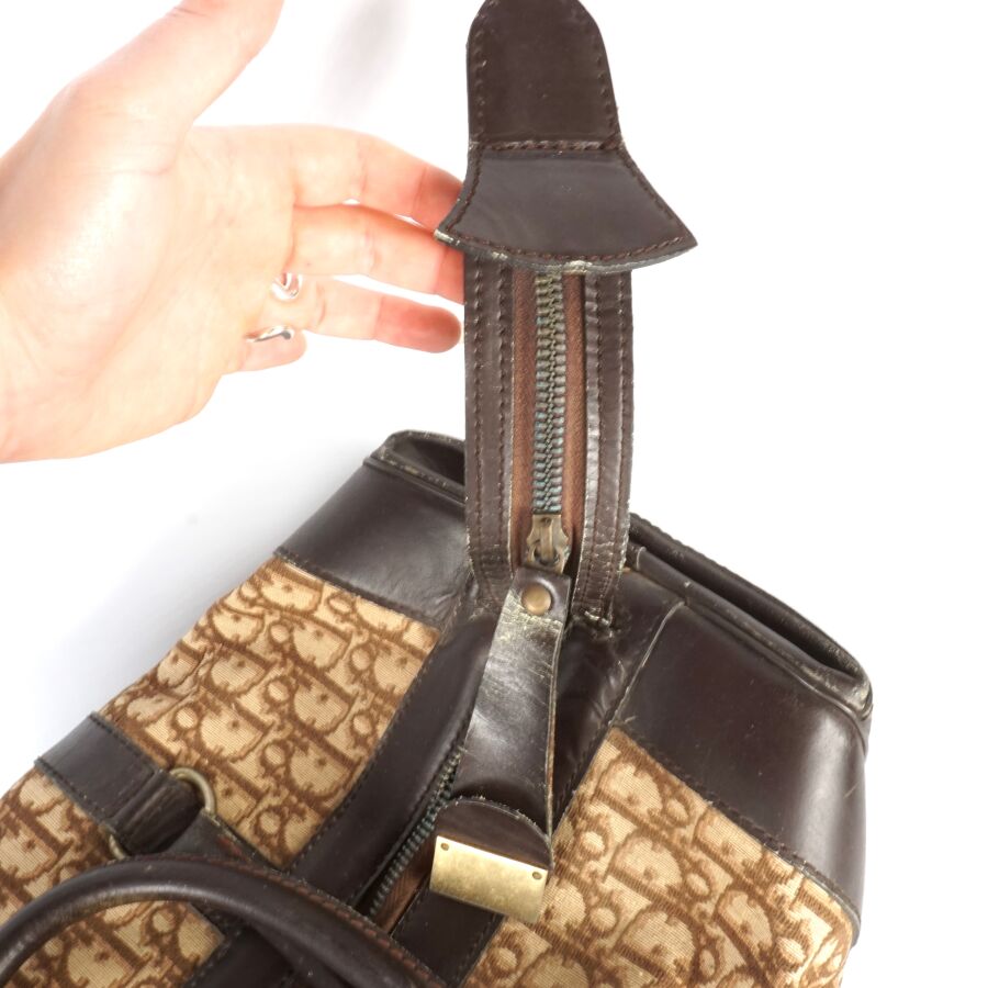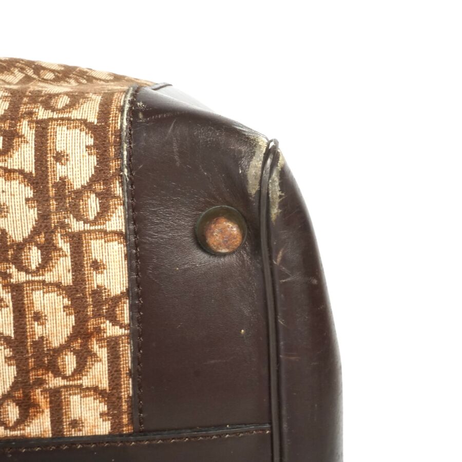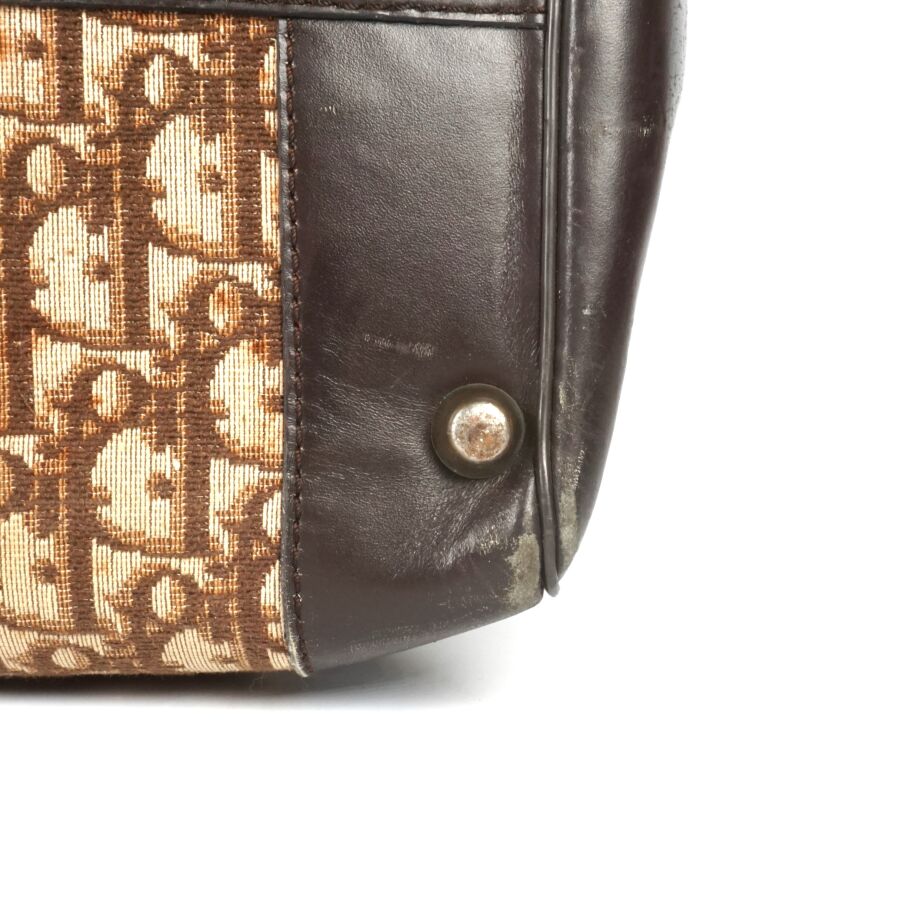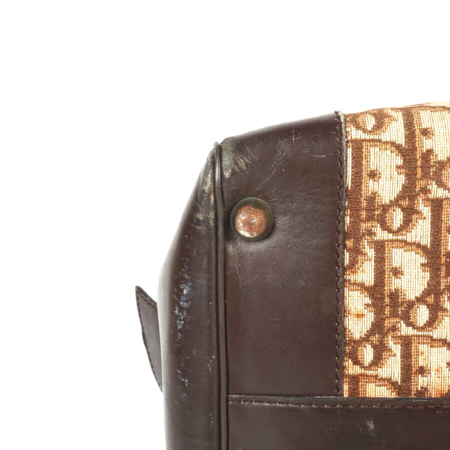 CHRISTIAN DIOR - BAGAGES : Sac de voyage en cuir brun foncé et toile jacquard oblique monogrammée sur fond beige, deux anses, fermeture zippée sur le dessus, système de fermeture latérale par clé, serrure en métal doré logotée "CD", intérieure beige avec quatre pochettes, Dim. 23.5 x 45 x 24 cm (usures, traces, manque la clé).
