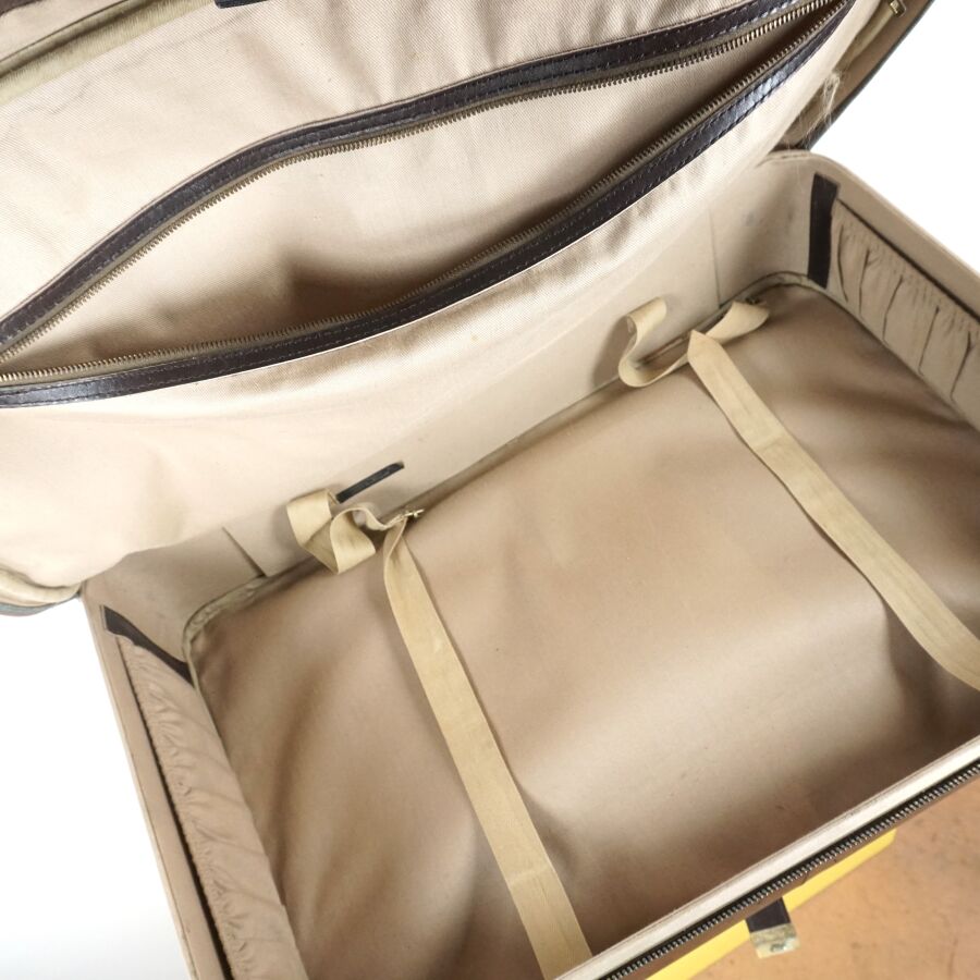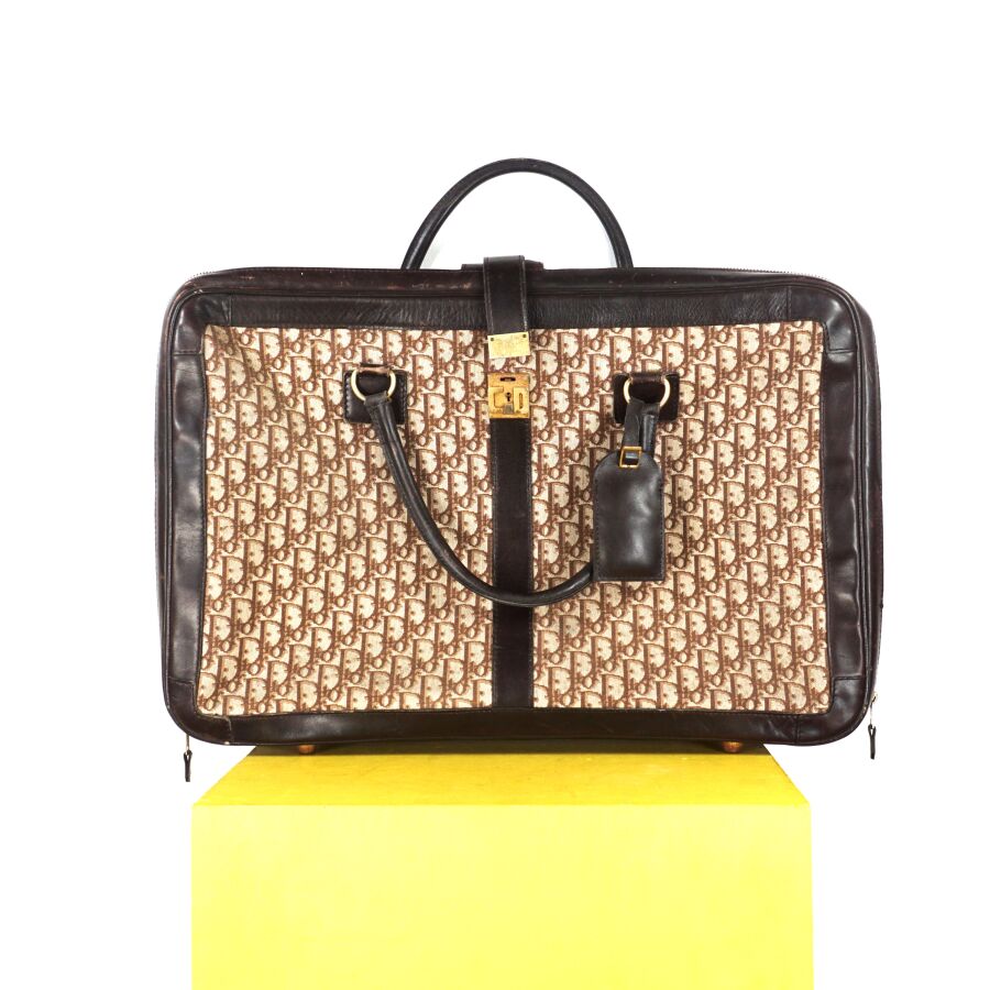 CHRISTIAN DIOR - BAGAGES : Valise en cuir brun foncé et toile jacquard oblique monogrammée sur fond beige, deux anses pour un porté main, fermeture zippée et sangle en cuir, système de fermeture en métal doré logoté "CD", toile beige à l'intérieur, deux pochettes latérales et une pochette principale à fermeture zippée, avec deux sangles, présentée avec son porte-carte, Dim. 38 x 59 x 17.5 cm (usures et traces, rouille à la bijouterie en métal, fermeture non fonctionnelle, sans la clé).
