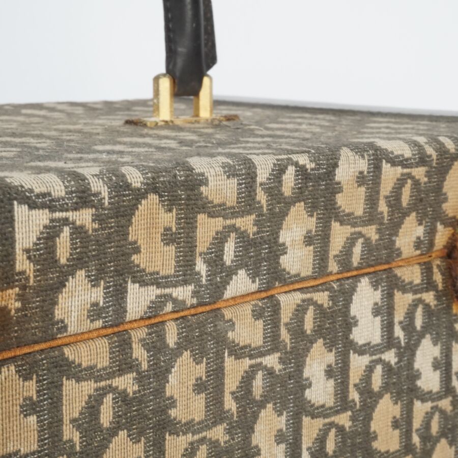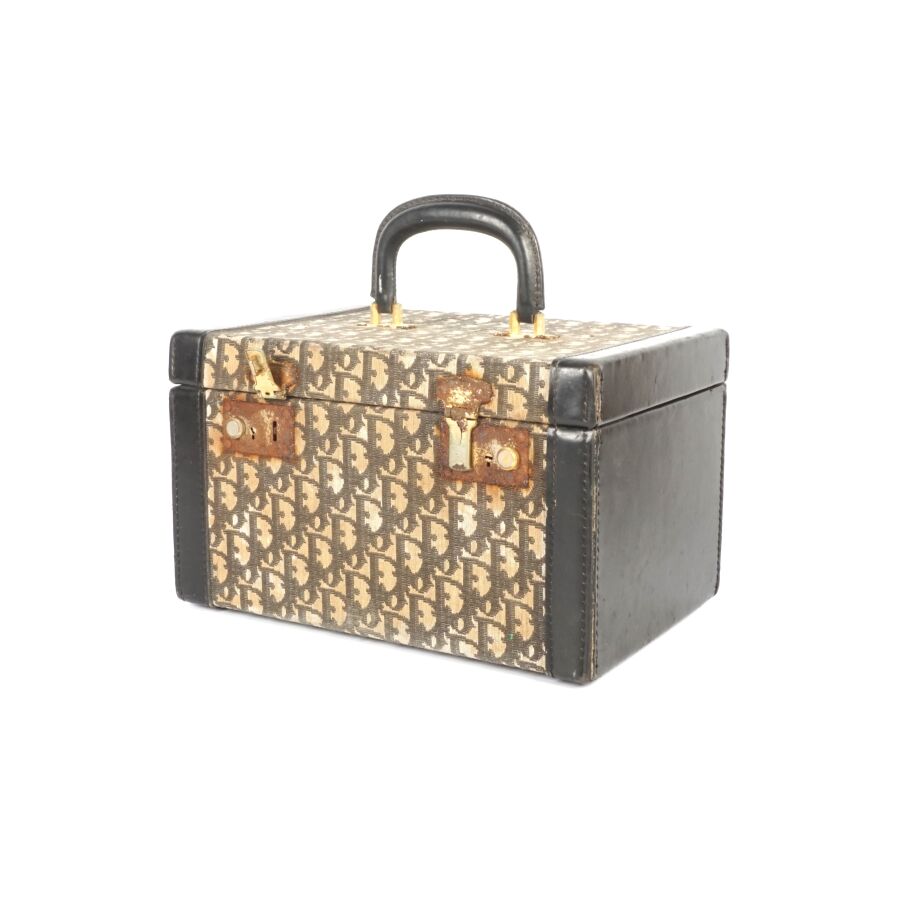 CHRISTIAN DIOR - BAGAGES : Vanity en cuir brun-noir et toile jacquard oblique monogrammée sur fond beige, une anse sur le dessus pour un porté main, fermeture en métal doré, découvrant à l'intérieure une lanière en cuir pour des compartiments à flacon, deux sangles à bouton pression et deux compartiments latéraux, Dim. 18.5 x 30 x 20.5 cm (en l'état, usures au cuir, métal rouillé en l'état, déchirure à l'intérieur).