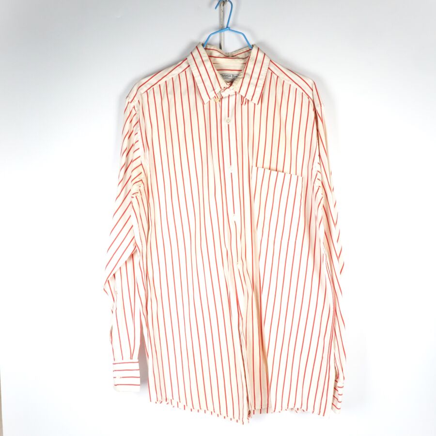 CHRISTIAN DIOR - BOUTIQUE : Chemise en coton de couleur blanche à rayures roses, fermeture à l'avant par six boutons nacrés, manches longues avec fermeture à l'extrémité par un bouton, étiquette intérieure, taille supposée S/M, L. Totale : 82 cm (petits fils tirés, légères taches jaunies au col).