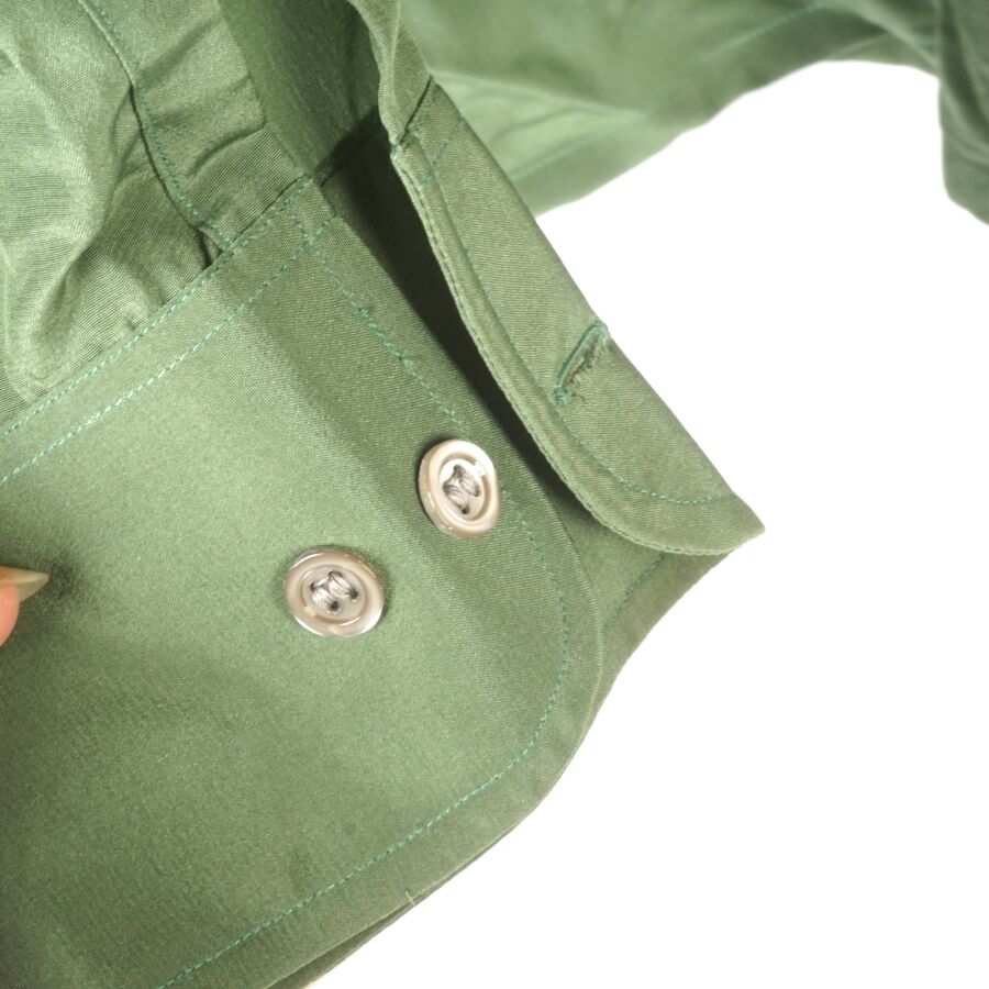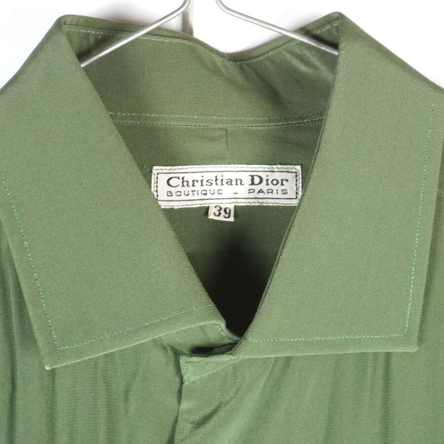 CHRISTIAN DIOR - BOUTIQUE : Chemise en soie de couleur verte, fermeture à l'avant par six boutons nacrés, manches longues avec fermeture à l'extrémité par un bouton, étiquette intérieure, indication 39, L. Totale : 81.5 cm (petits fils tirés, quelques traces légères).
