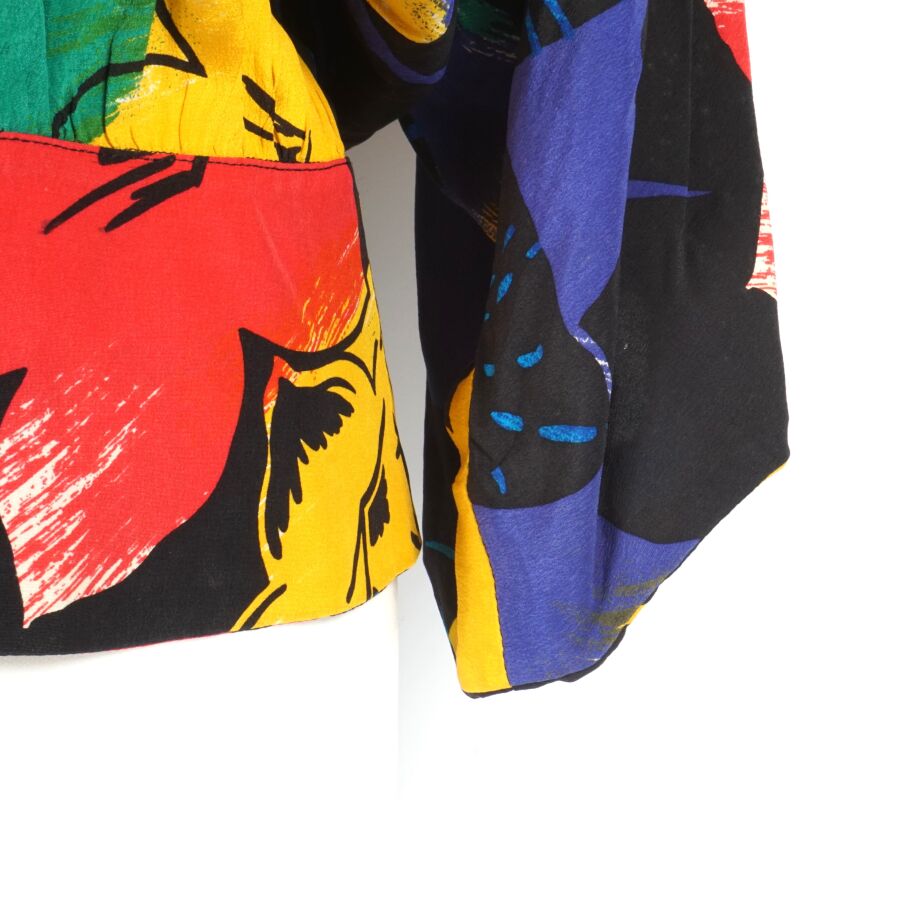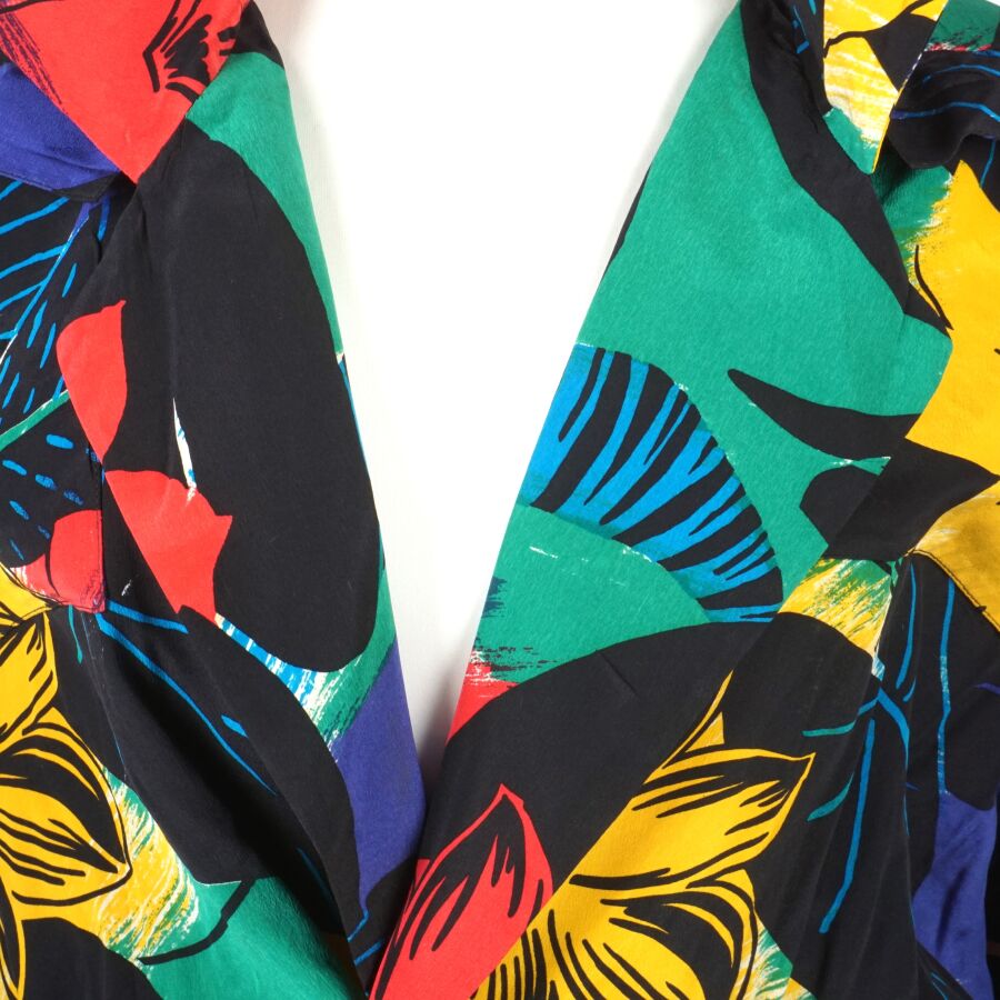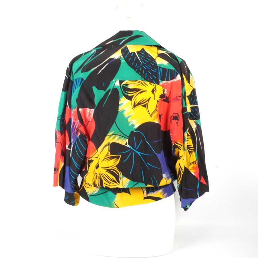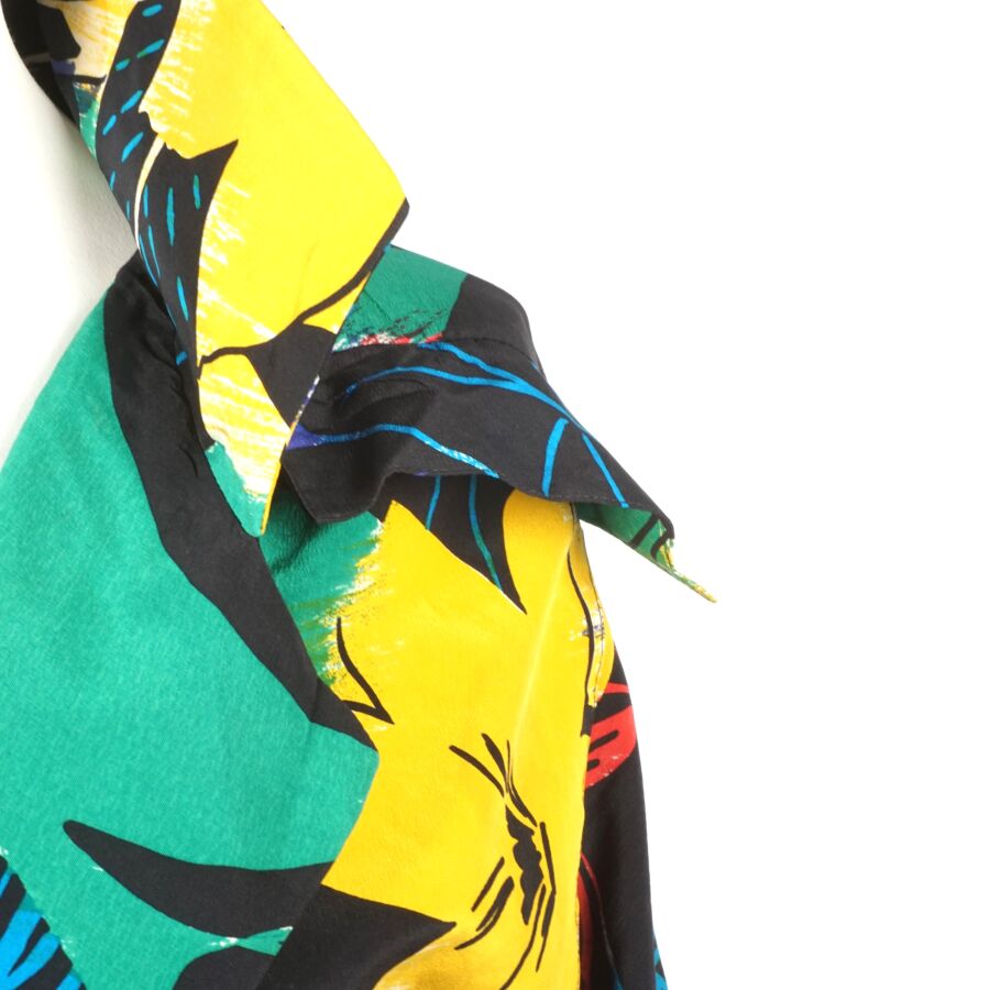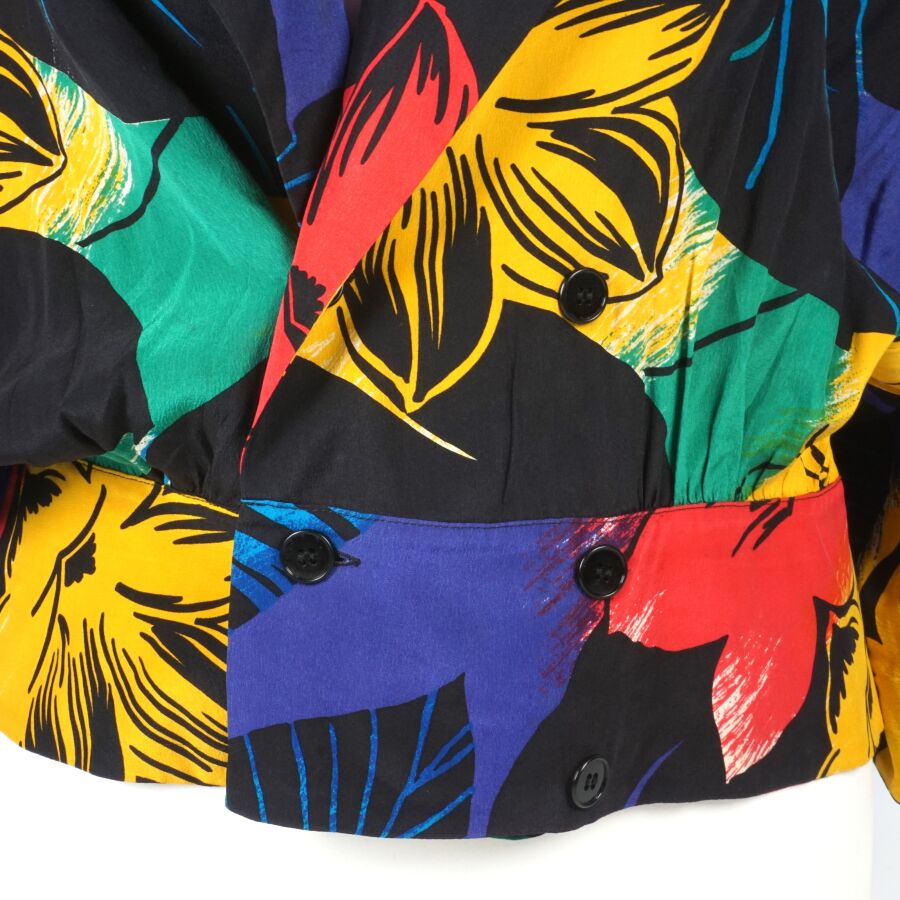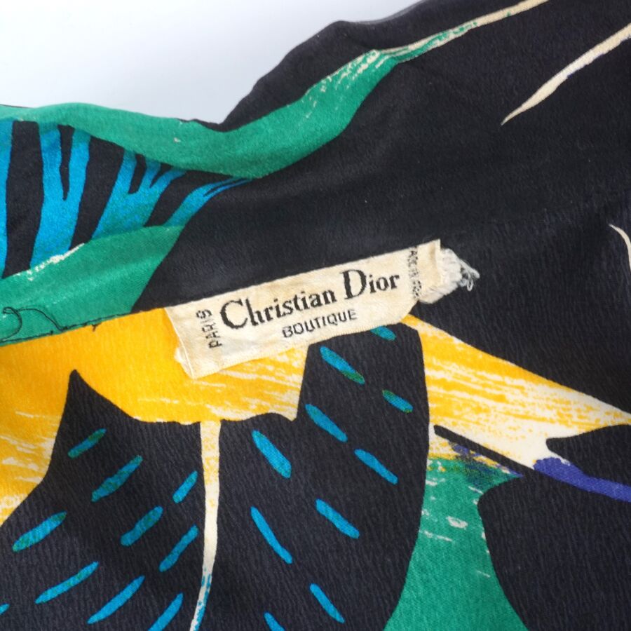 CHRISTIAN DIOR - BOUTIQUE : Chemise en soie polychrome à motif floral sur fond noir, col tailleur, fermeture à l'avant par trois boutons (possible des deux côtés), manches courtes, deux poches latérales extérieures hautes, étiquette intérieure, taille supposée M, H. Totale : 61 cm environ (petits fils tirés).