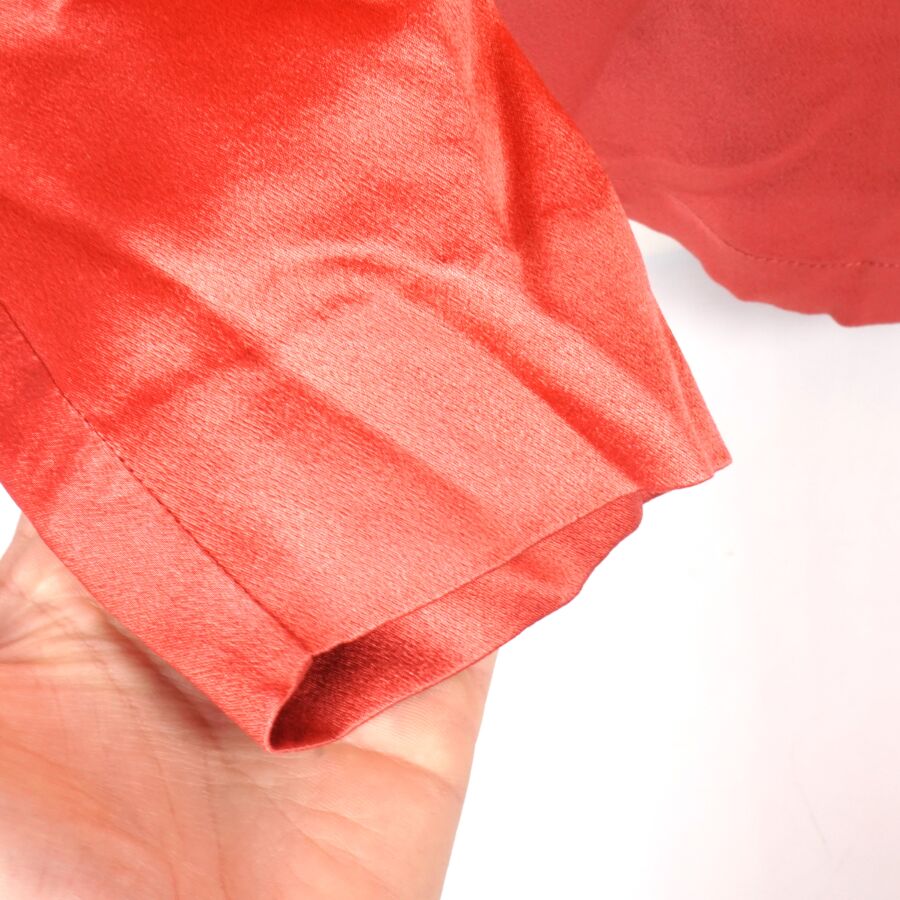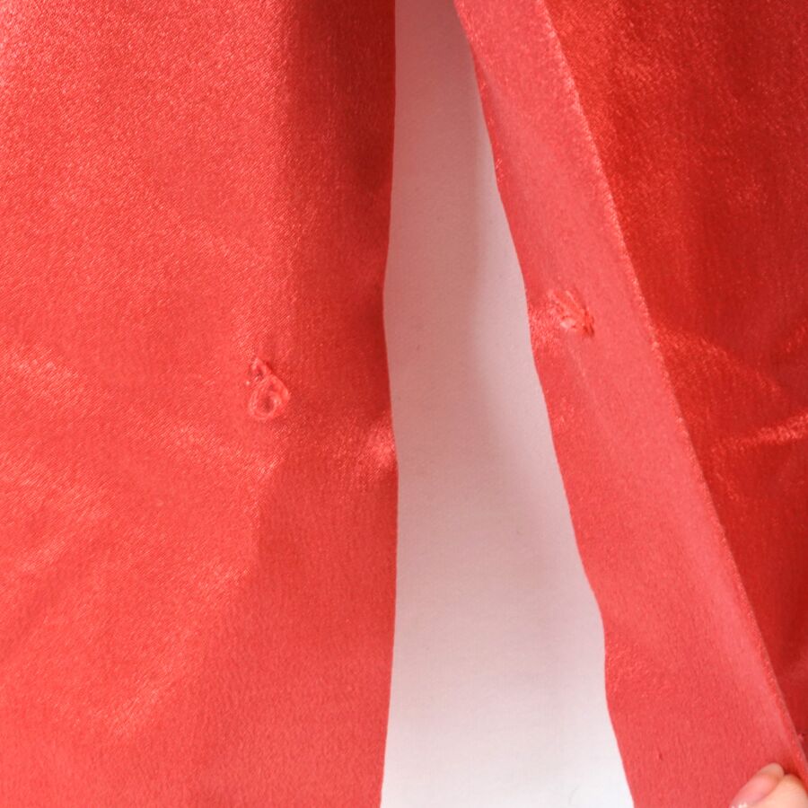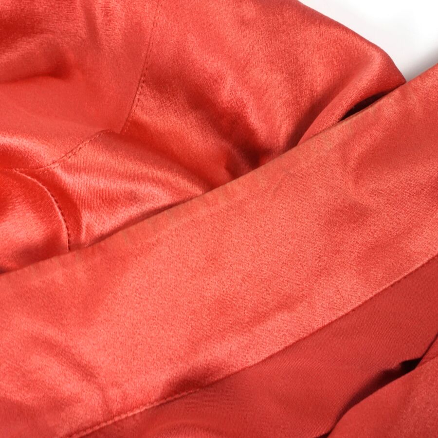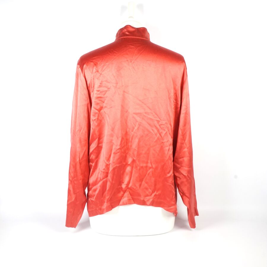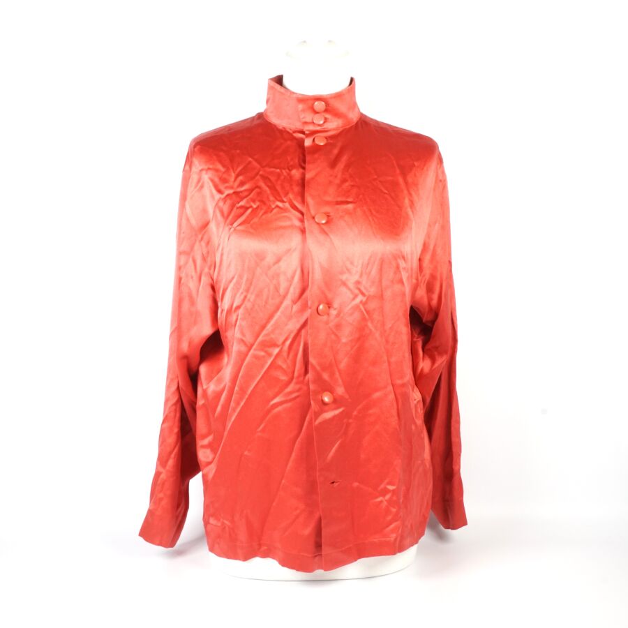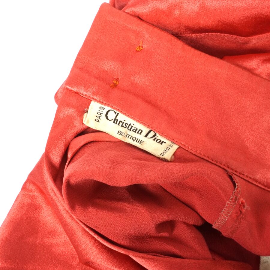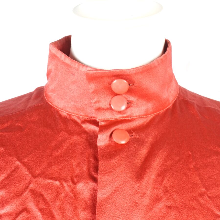 CHRISTIAN DIOR - BOUTIQUE : Chemise en soie rose-corail, col montant rond, fermeture par sept boutons en bakélite rose (manque un bouton en bas), manches longues, étiquette intérieure, taille supposée M, présentée avec son cintre logoté, H. Totale : 66 cm (petits fils tirés).