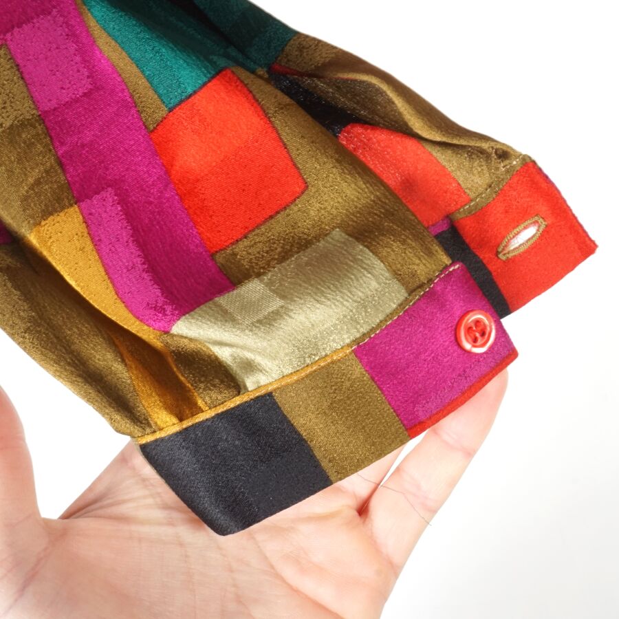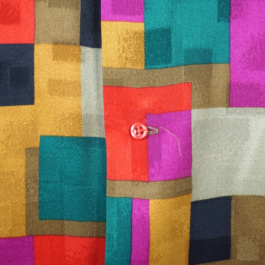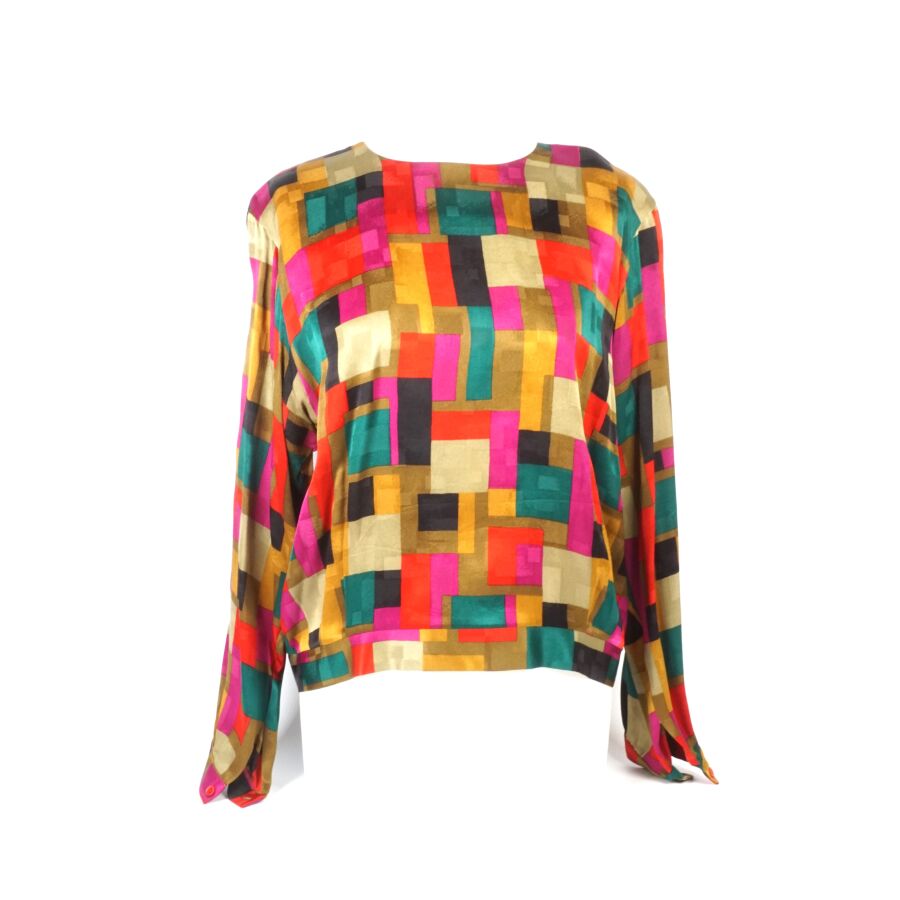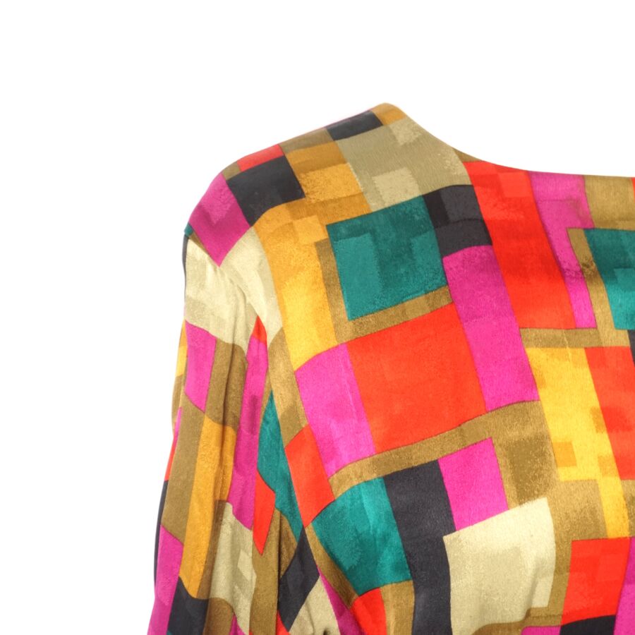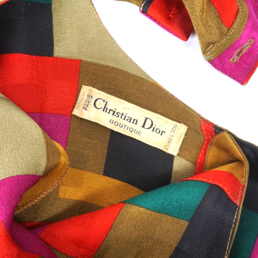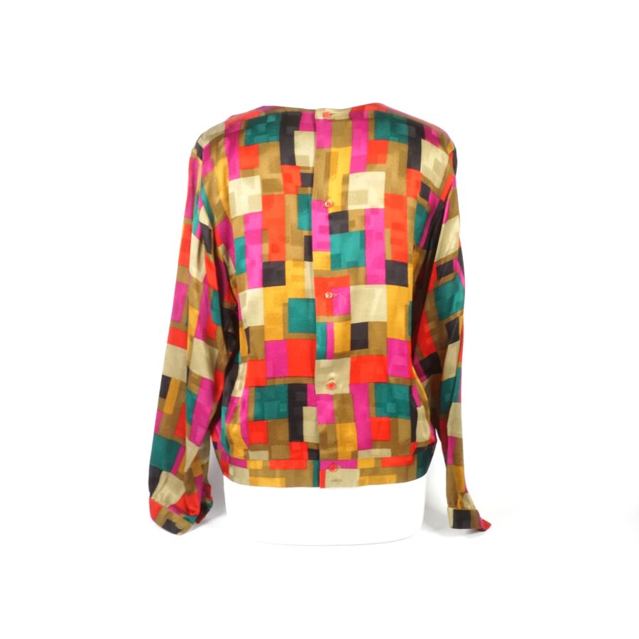 CHRISTIAN DIOR - BOUTIQUE : Chemisier en soie à motif géométrique polychrome, col rond, fermeture à l'avant par six boutons roses, manches longues, les extrémités fermant à un bouton, étiquette intérieure, taille supposée M, présenté avec son cintre logoté, H. Totale : 53.5 cm (petites fils tirés).
