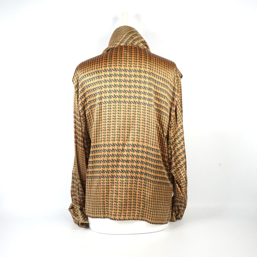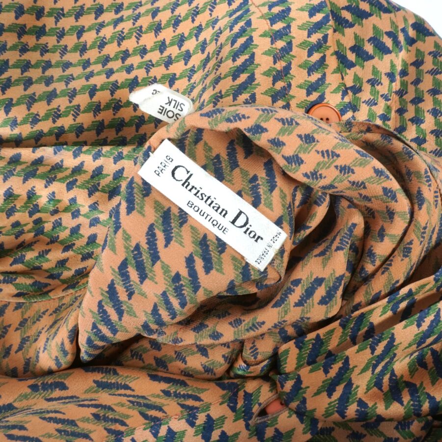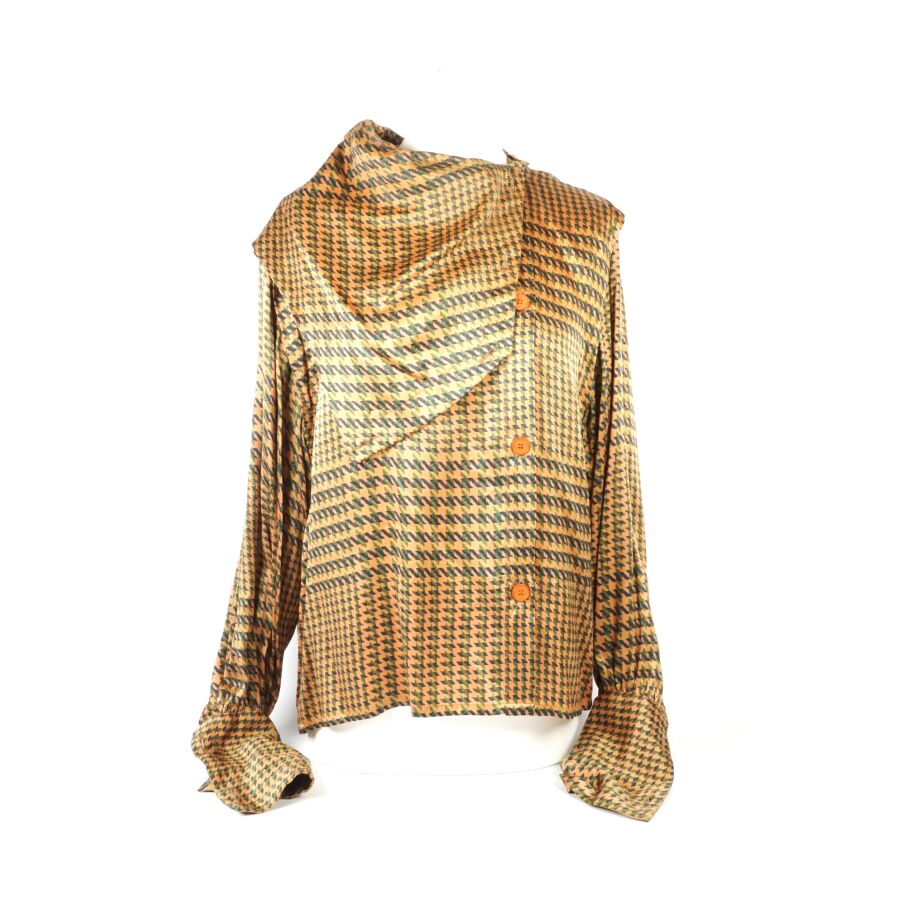 CHRISTIAN DIOR - BOUTIQUE : Chemisier en soie ocre et vert, fermeture latérale par quatre boutons en bakélite marron, col asymétrique style "cheminée" effet bouffant à boutonner, manche longue, étiquette intérieure, taille supposée M, présentée avec son cintre logoté, H. Totale : 61 cm (petites usures).