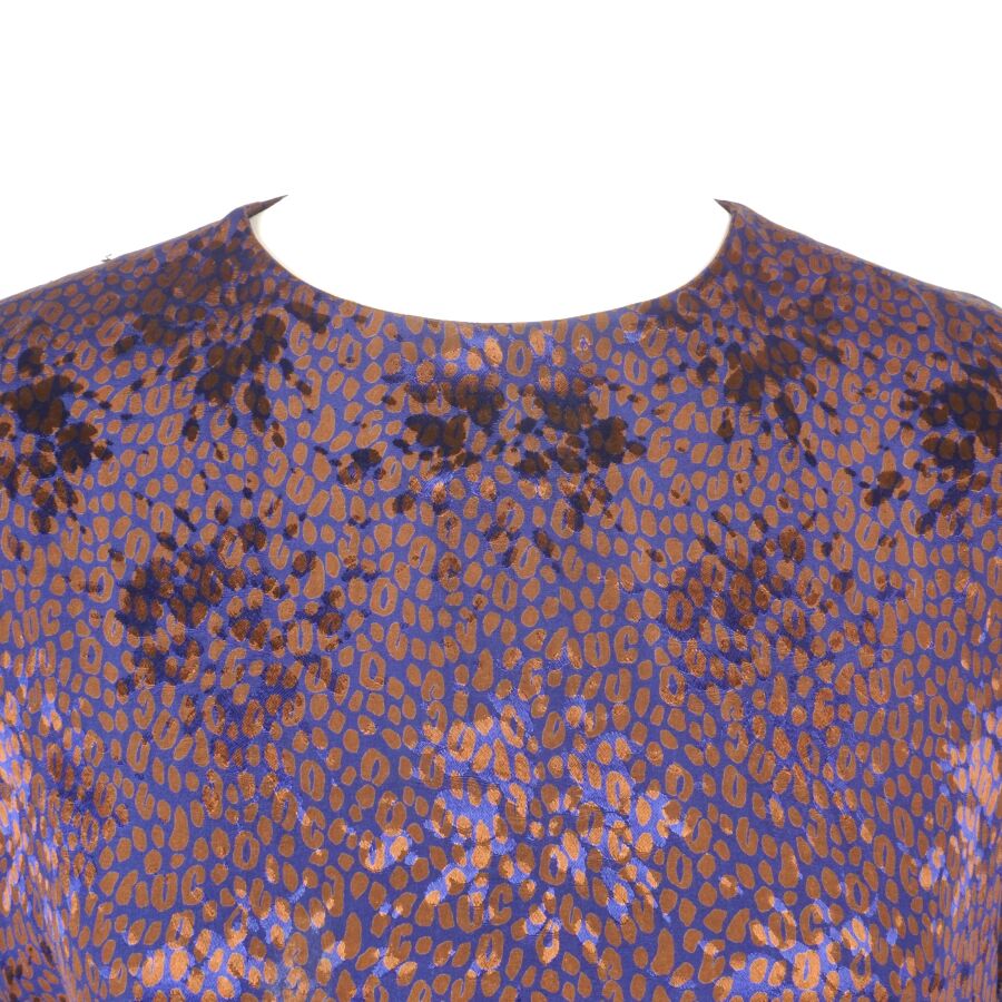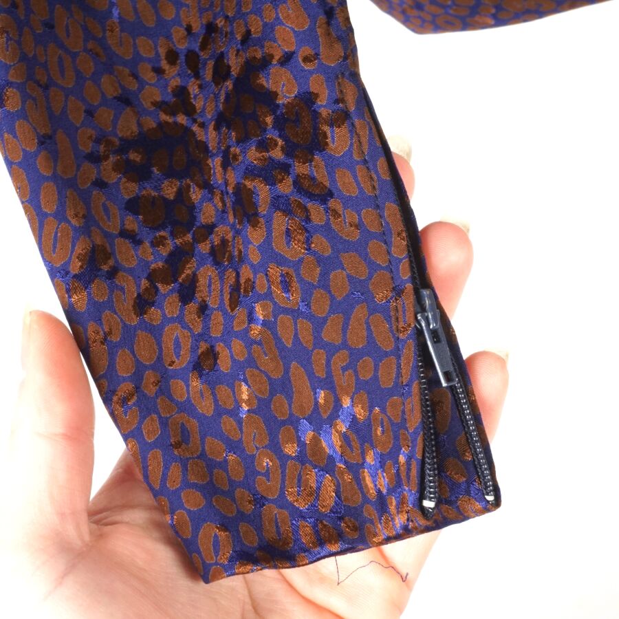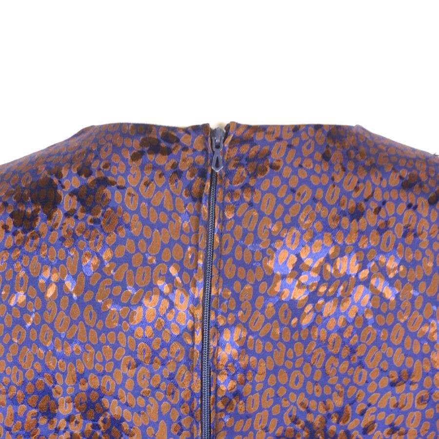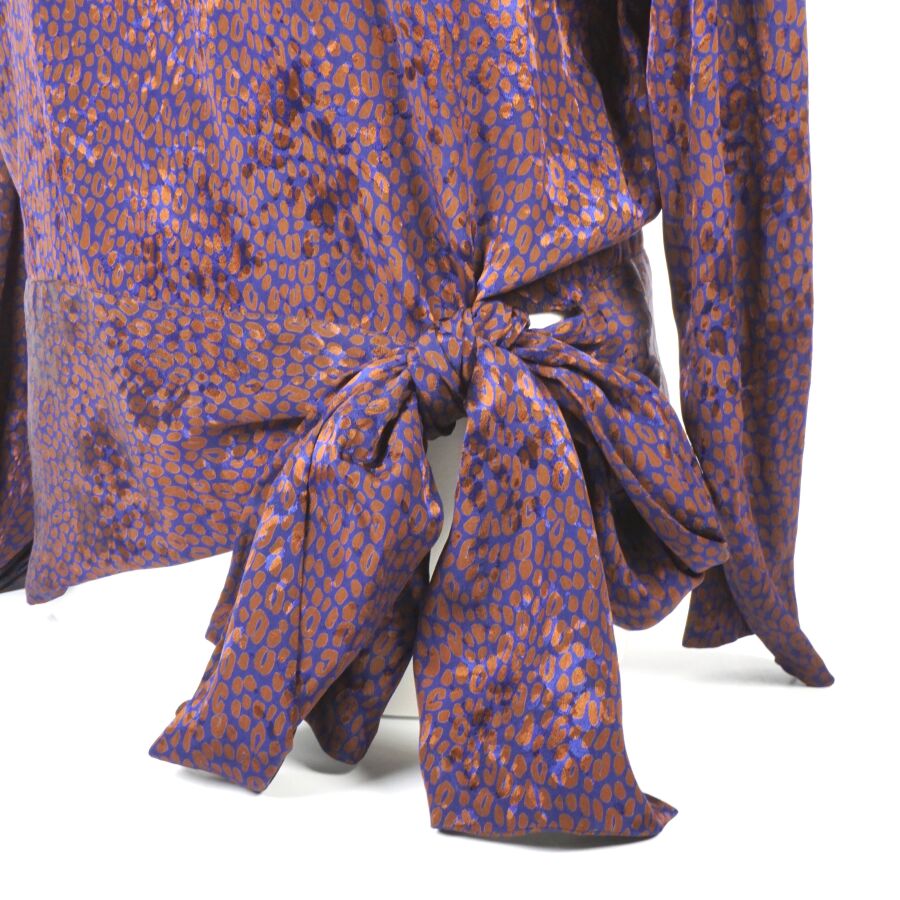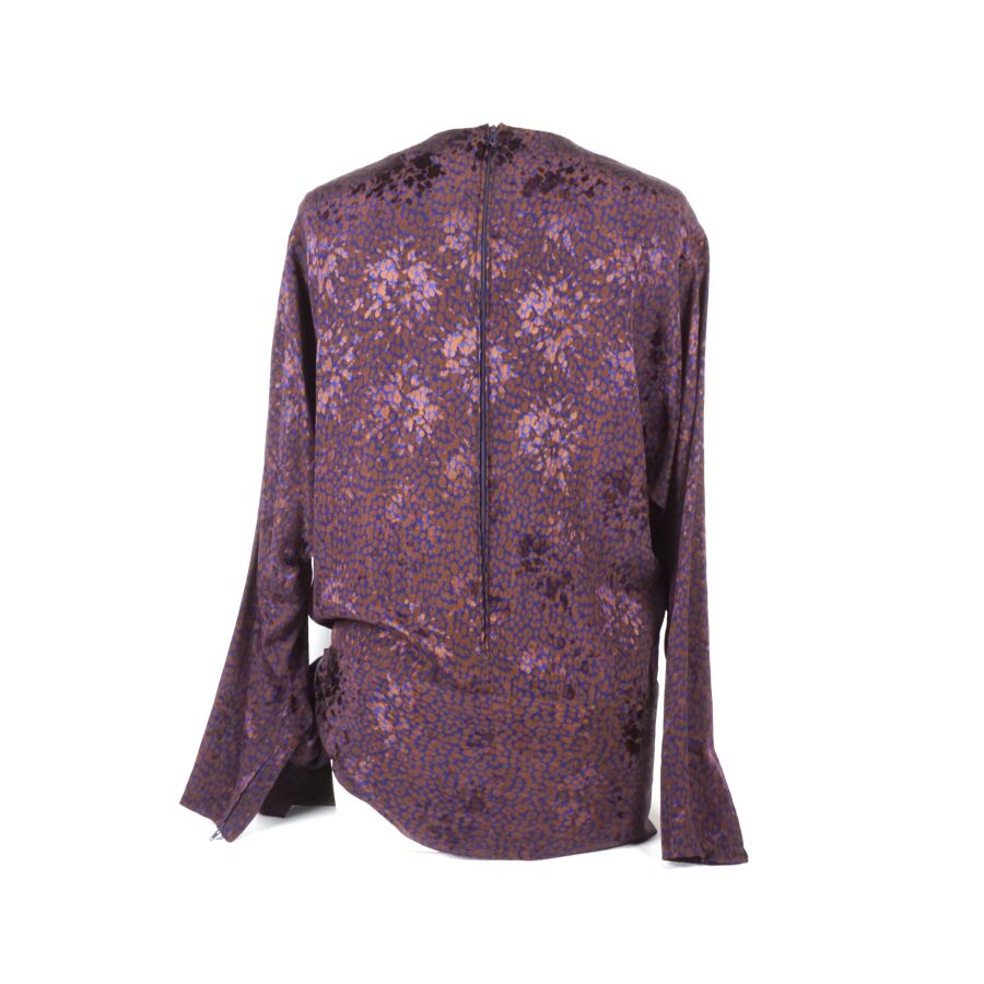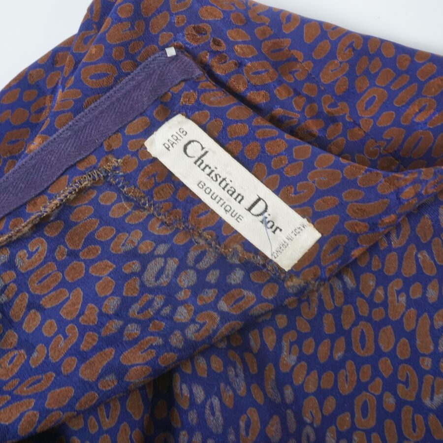 CHRISTIAN DIOR - BOUTIQUE : Chemisier en soie violet/ocre sur fond bleu nuit, col rond, manche longue, fermeture à l'arrière zippée, noeud à nouer en partie basse, étiquette intérieure, taille supposée M, H. Totale : 66 cm environ.