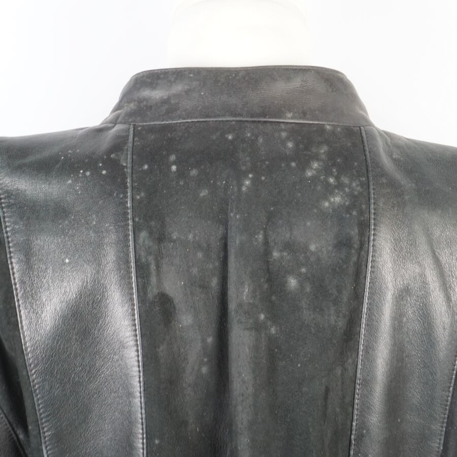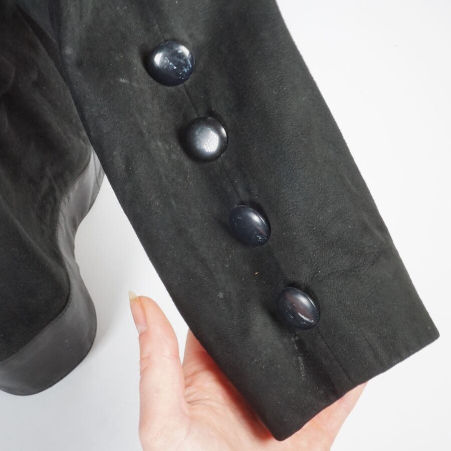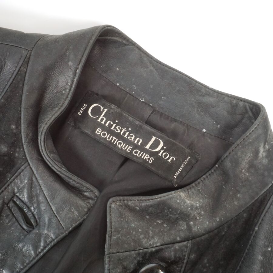 CHRISTIAN DIOR - BOUTIQUE CUIRS : Veste en cuir et daim noir, doublure en soie noire, col rond, fermeture à l'avant par quatre boutons, manches longues terminant aux extrémités par quatre boutons, deux poches latérales, étiquette intérieure, taille supposée M, présentée avec un cintre logoté, H. Totale : 68.5 cm (nombreuses taches d'humidité).