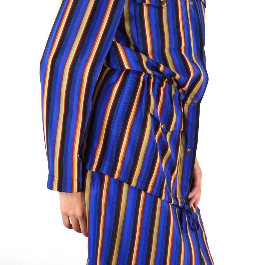 CHRISTIAN DIOR - BOUTIQUE : Ensemble en soie à motif rayé jaune, rouge et noir sur fond bleu Roy comprenant un top manche courte, coupe droite, une jupe droite style portefeuille, fermeture à cinq boutons à la taille et veste style saharienne, col dit "Mao", fermeture à l'avant par sept boutons pressions, manches longues, quatre poches extérieures à fermeture par bouton pression, lien de resserrement en bas, étiquettes intérieures, taille supposée S/M, L. Jupe : 68 cm environ. Larg. Jupe : 35 cm. L. Top (hors bretelles) : 47 cm. H. Totale Veste : 80 cm.