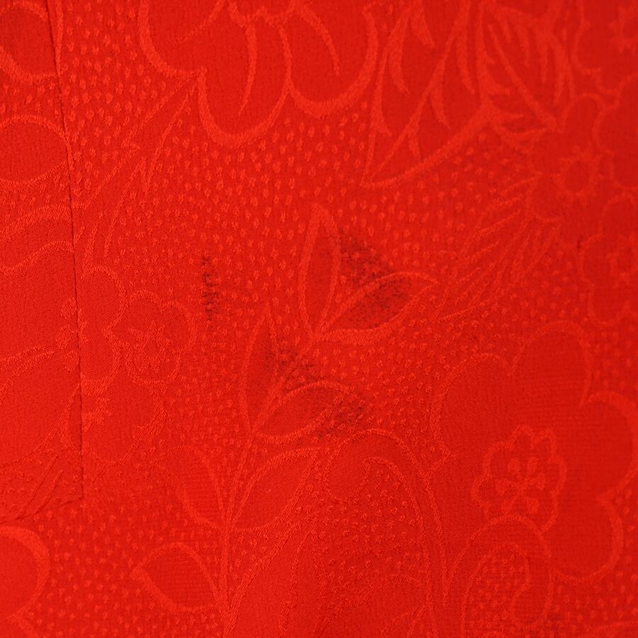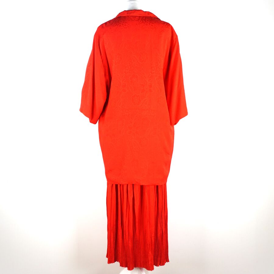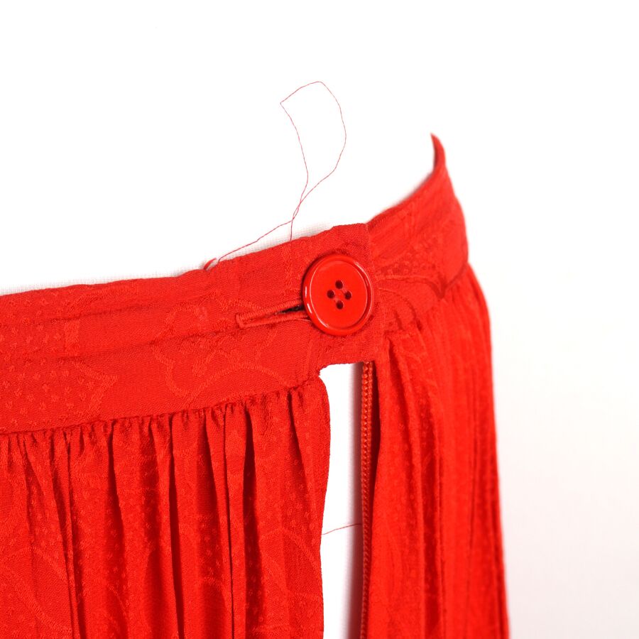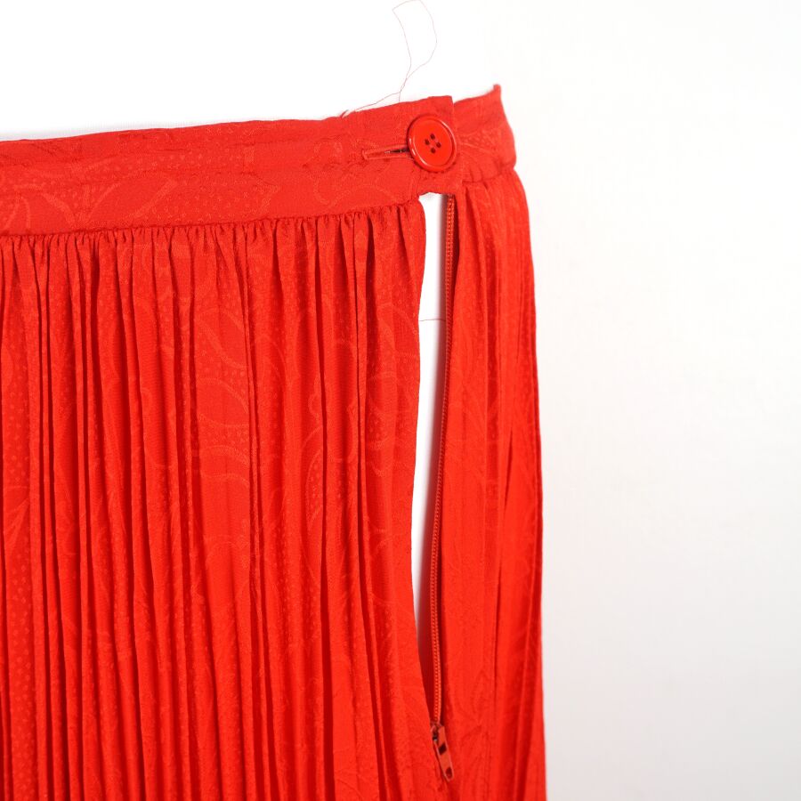 CHRISTIAN DIOR - BOUTIQUE : Ensemble en soie rouge comprenant un haut type tunique, col en V dit tailleur, manche 3/4, fendu en partie basse, et sa jupe plissée, fermeture à la taille par un bouton, un crochet et une fermeture zippée, étiquettes intérieures, taille supposée M, L. Tunique : 84.5 cm. L. Jupe : 82 cm. Larg. Jupe : 43 cm (quelques taches, fils tirés).